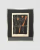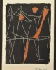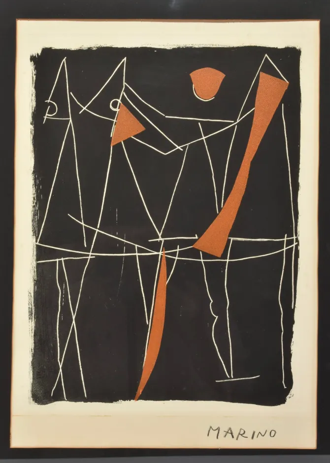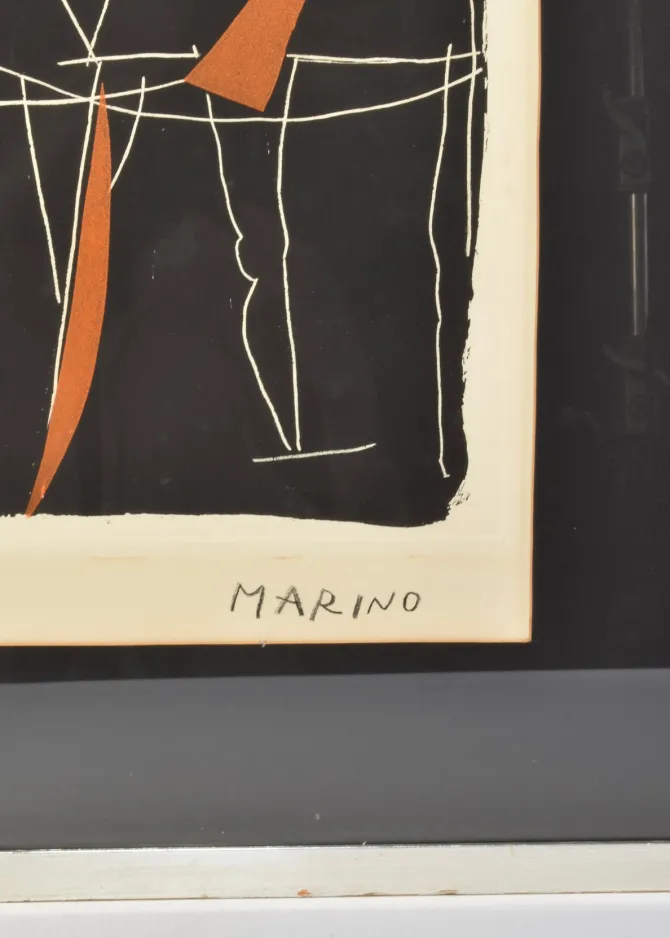 An abstract figural composition by Italian artist, Marino Marini, featuring a rhythmic linear abstraction in black and orange. Sharp white outlines suggest a chorus of stylized figures or horses in motion, a nod to Marini’s recurring equestrian themes. Areas of dense orange ground lend visual weight and sculptural contrast. Signed Marino in the lower right.