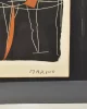 Framed under glass in a silver-tone metal frame with black matte. Wired on the back for hanging.