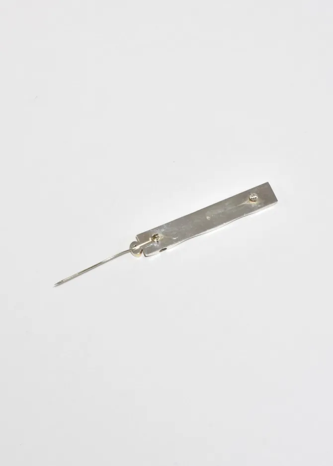 Rare, vintage sterling modernist brooch in an elongated wavy shape with ribbed detail and a faceted amethyst stone, pin-back closure, hole for pendant.