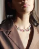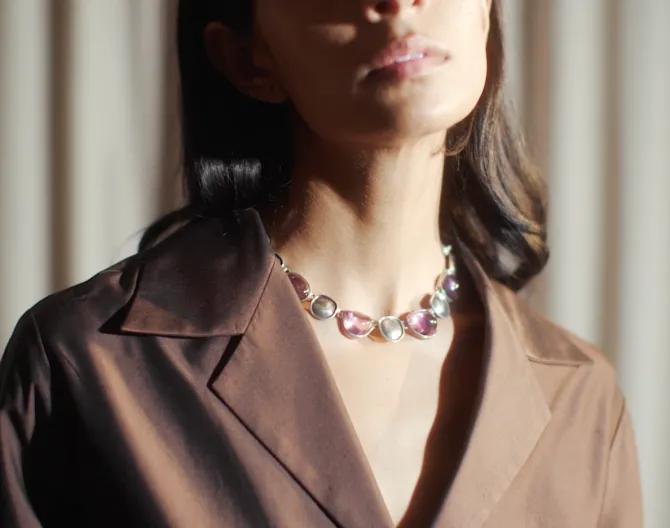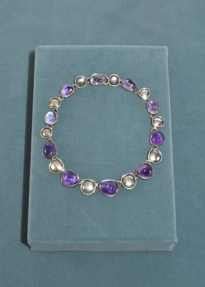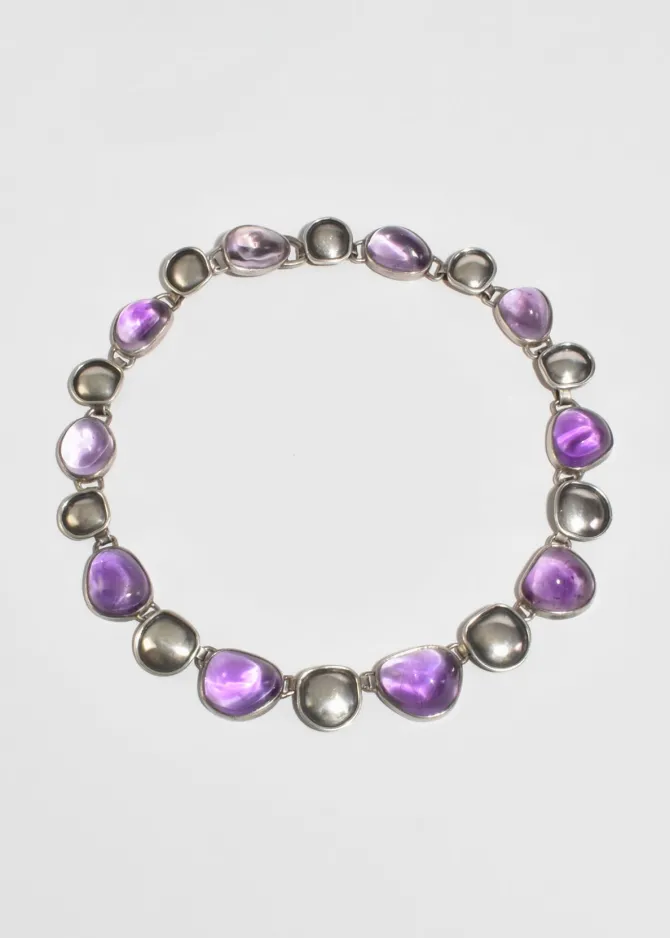 Rare, vintage handmade sterling necklace with organic shaped amethyst cabochons and sterling links, hook and eye closure.