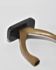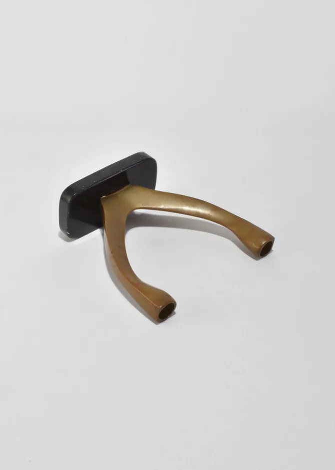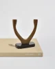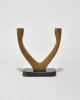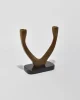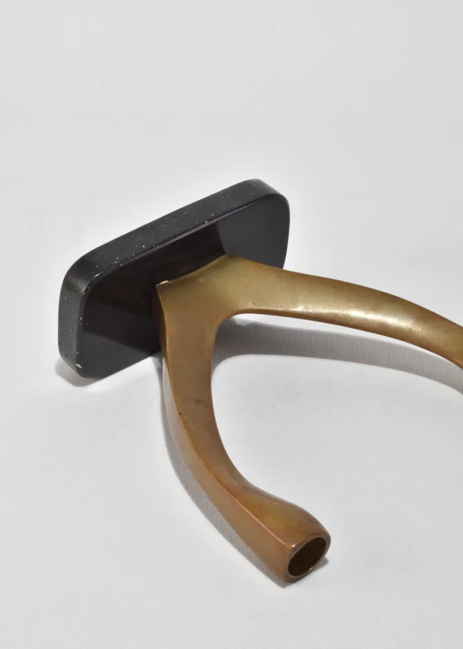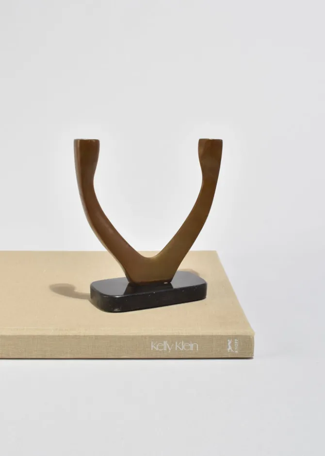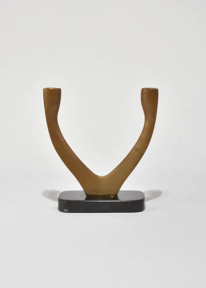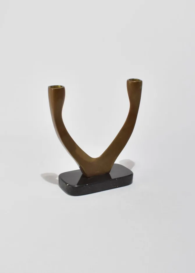 Vintage, two-arm bronze candelabrum attributed to sculptor, Chaim Gross. Fluid, modernist form set on a polished black stone base with rich natural patina.