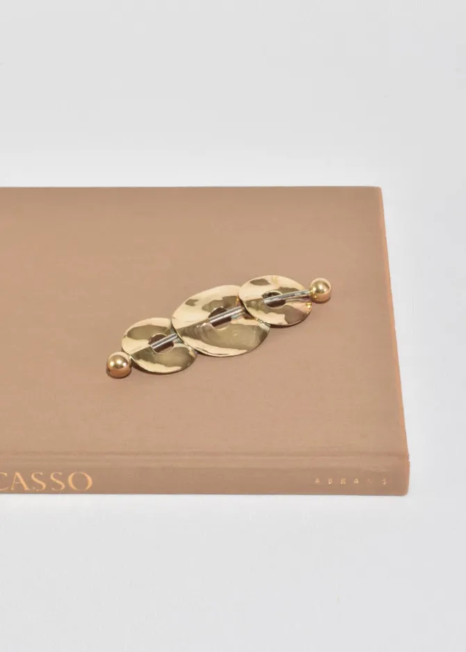 Rare, vintage modernist brooch in brass and sterling silver with organic circle detail and pin-back closure. Stamped,Louis Booth.