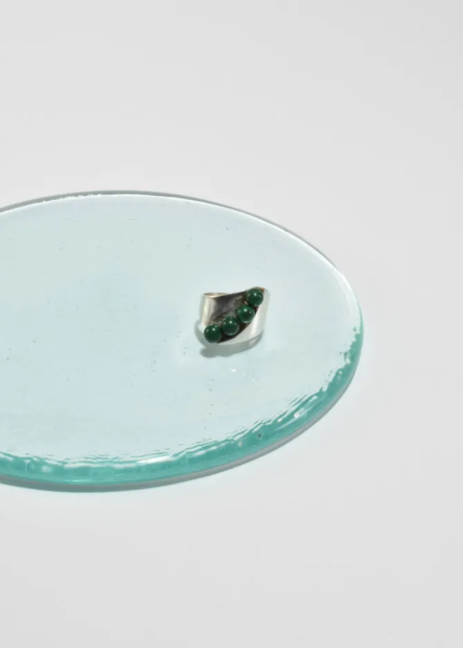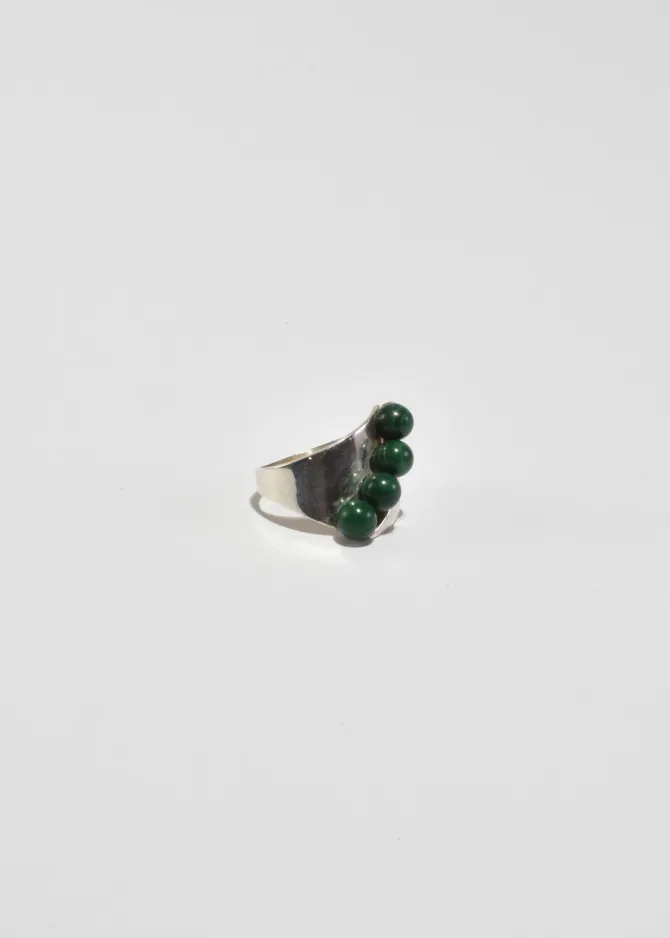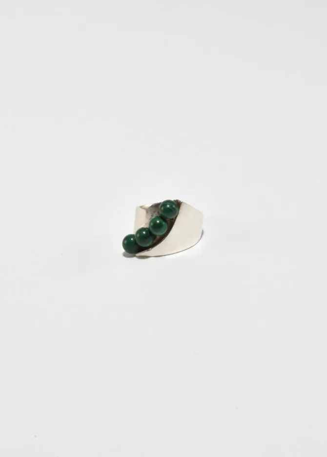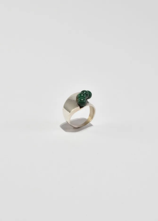 Vintage, sterling modernist ring with a curved design and malachite sphere detail, stamped,China 925.