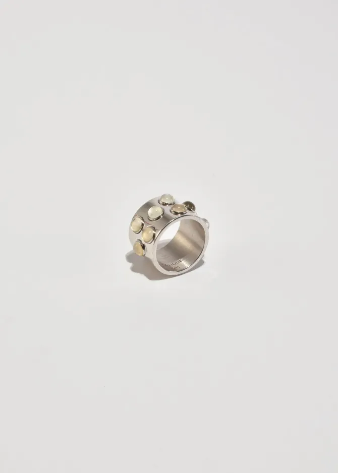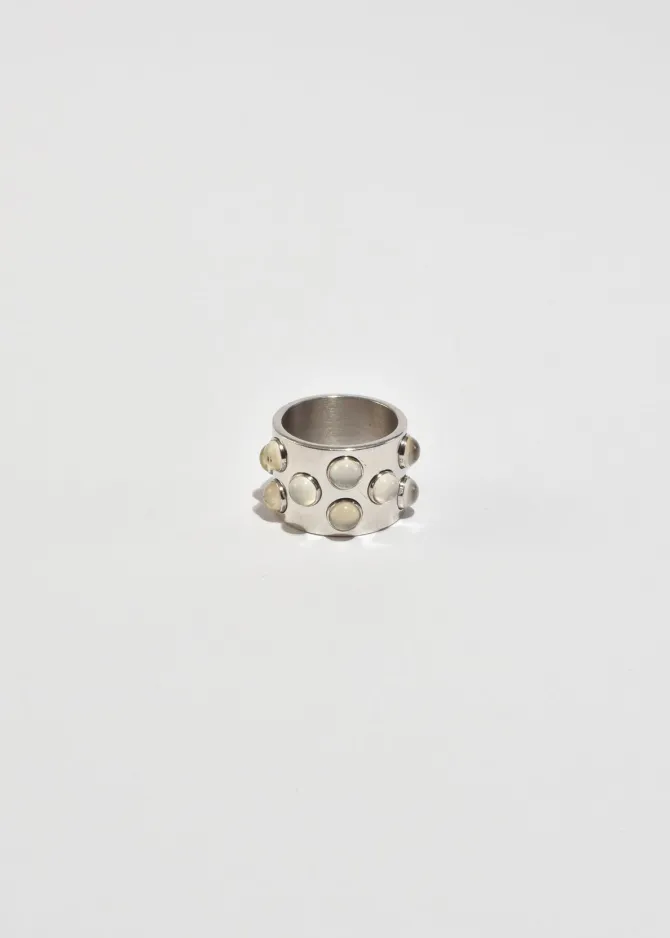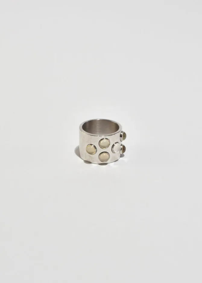 Rare, vintage sterling wide band ring with round moonstone cabochon detail. Stamped,Lalique 925.