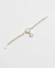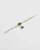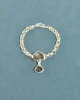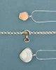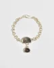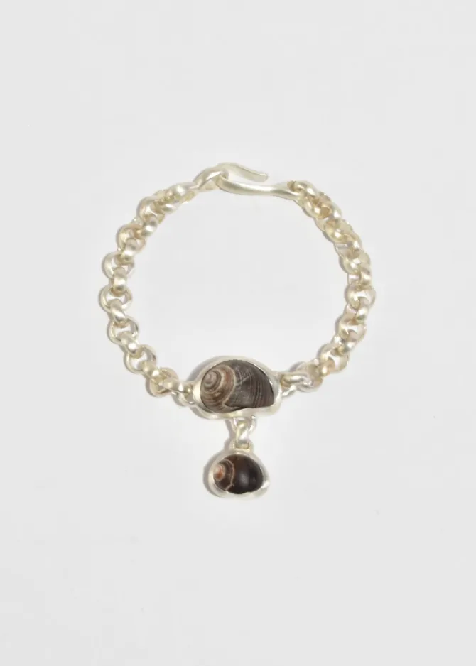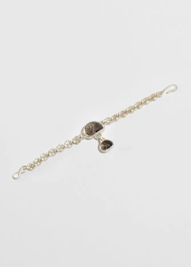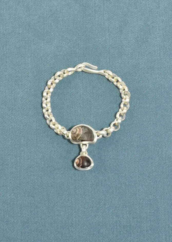 The Oliver Bracelet features a handmade sterling silver chain with two bezel set shells. Each link is cast in silver from wax, hand assembled in Brooklyn with a hook clasp.