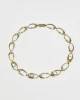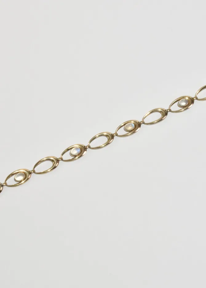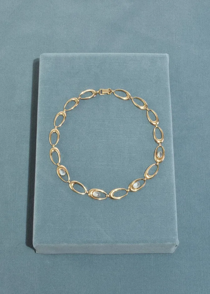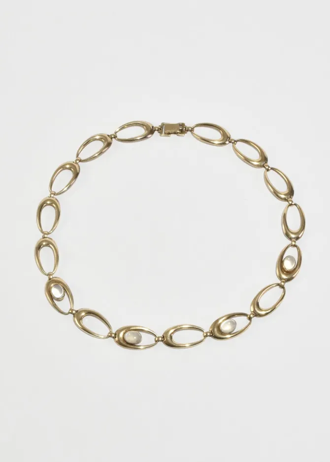 Rare, vintage 14k gold plated necklace with oval links and four oval moonstone cabochons and fold over clasp closure. Stamped,14k, Sterling, SYMMETALIC.