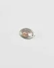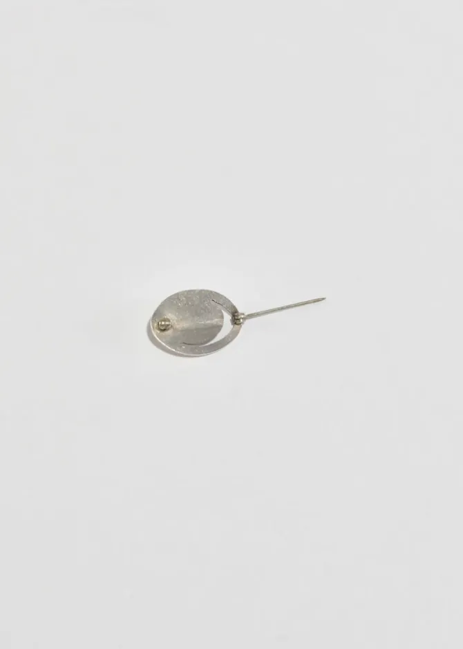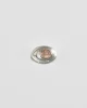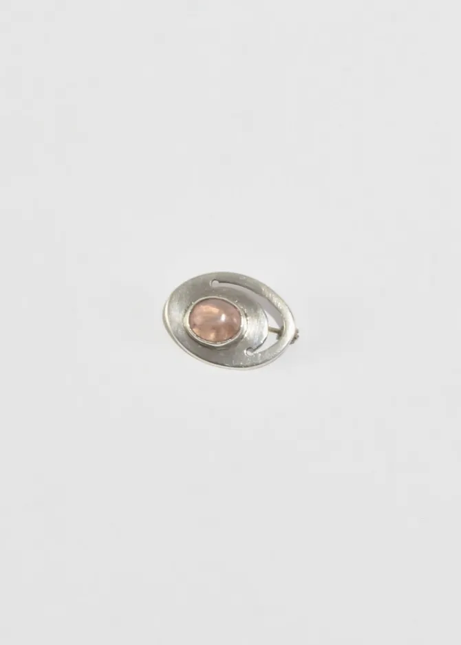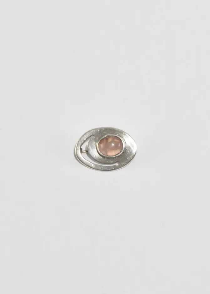 Vintage, sterling petite oval brooch with a cut-out design and an oval rose quartz cabochon, pin-back closure.
