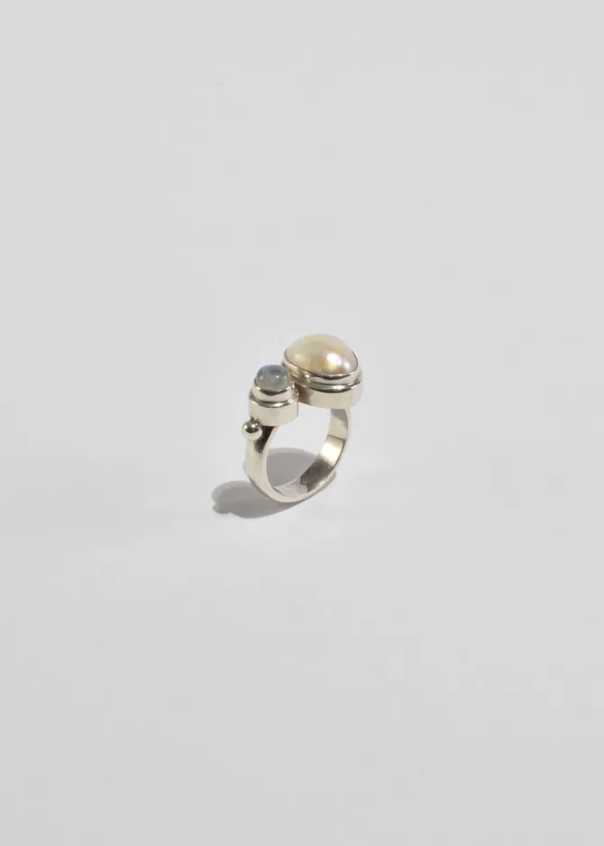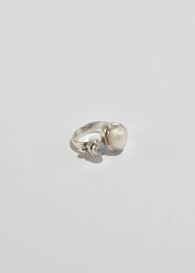 Rare, vintage sterling ring with an organic shaped pearl and a round moonstone cabochon. Stamped,925.