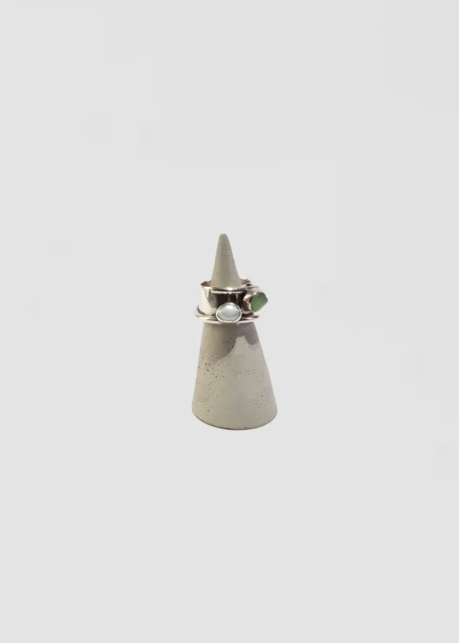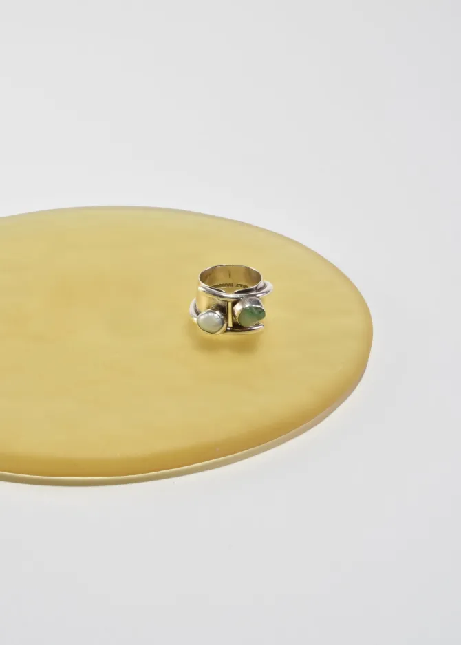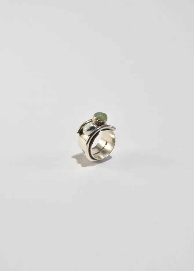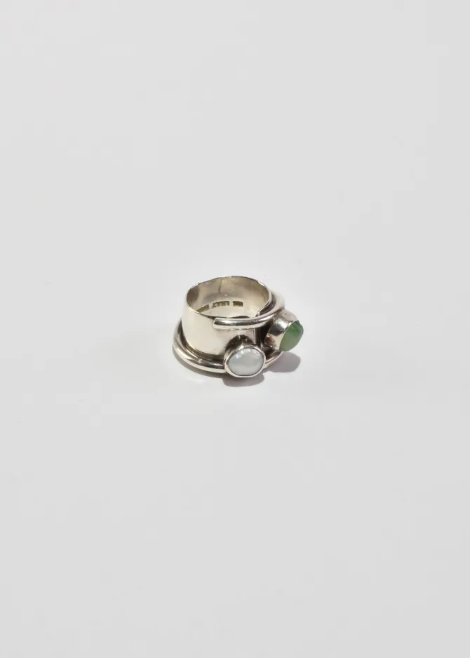 Stunning, vintage sterling wide band ring in a sculptural shape with organic pearl and prehnite stones. Stamped,Lilly Barrack 925.