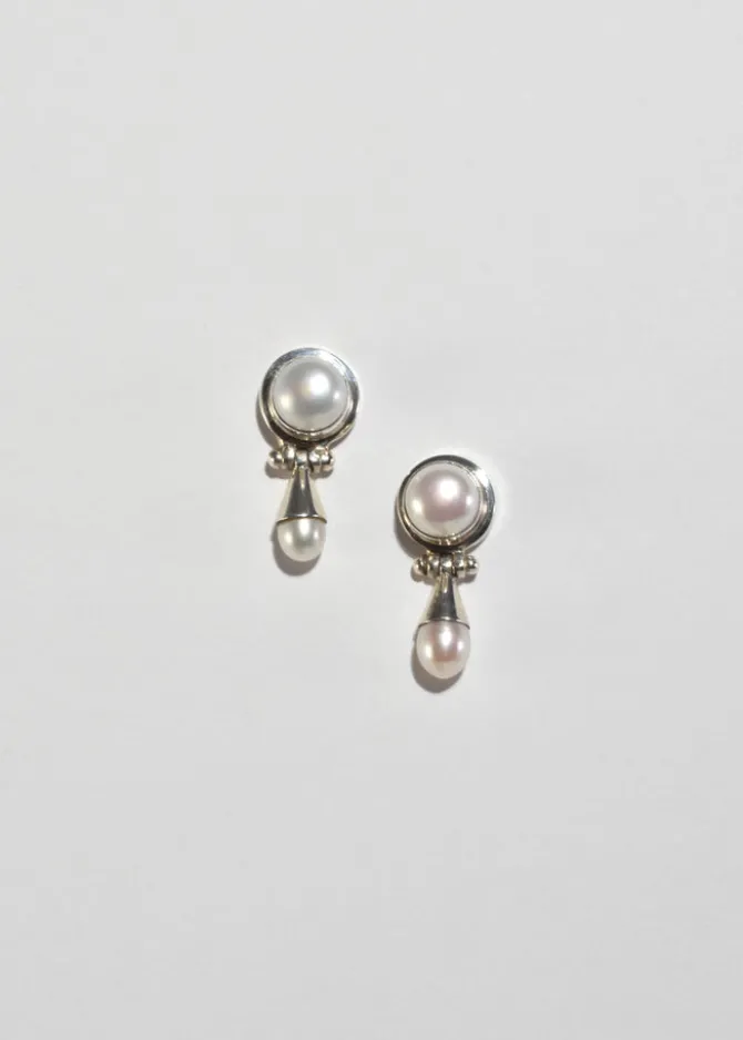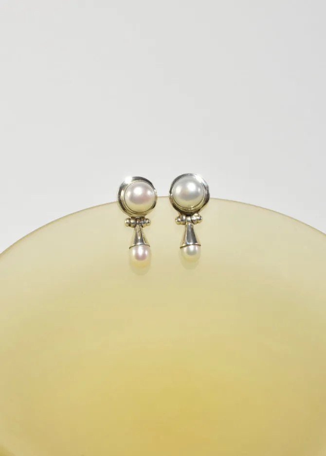 Classic, vintage sterling earrings with round pearl cabochons and pearl teardrop detail, pierced. Stamped,925.