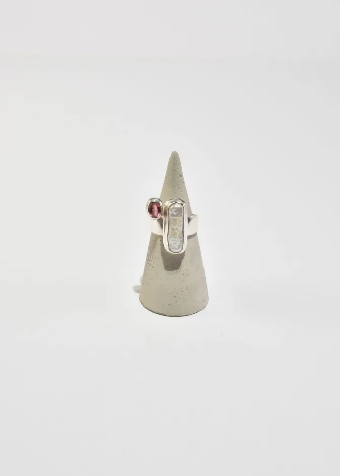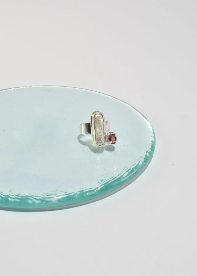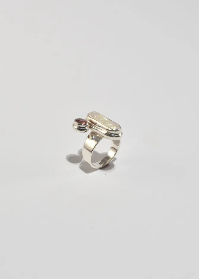 Stunning vintage sterling ring with an elongated freshwater pearl and a faceted pink tourmaline stone. Stamped,925.