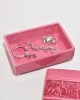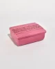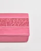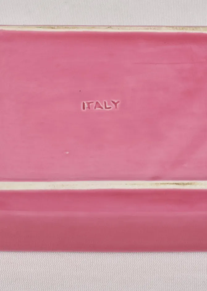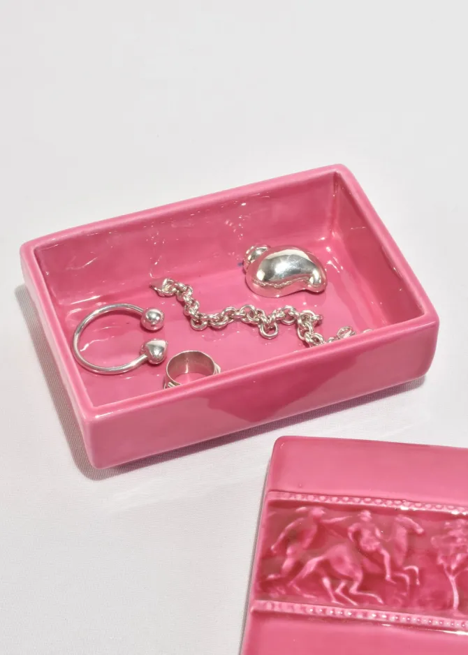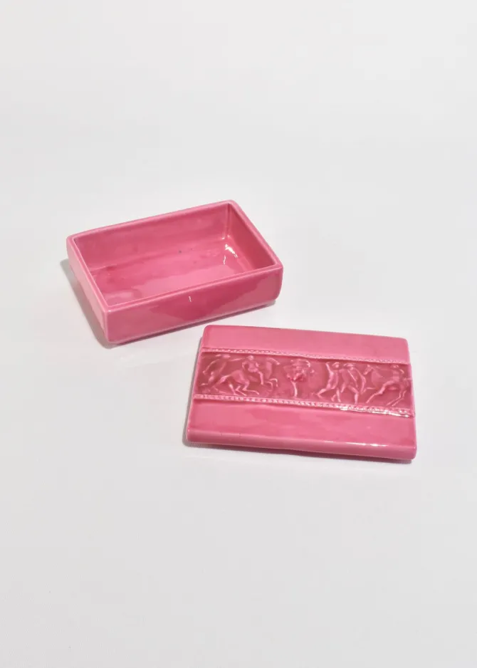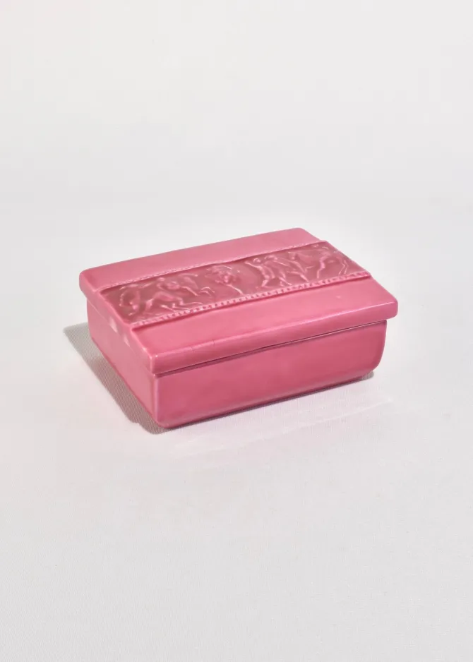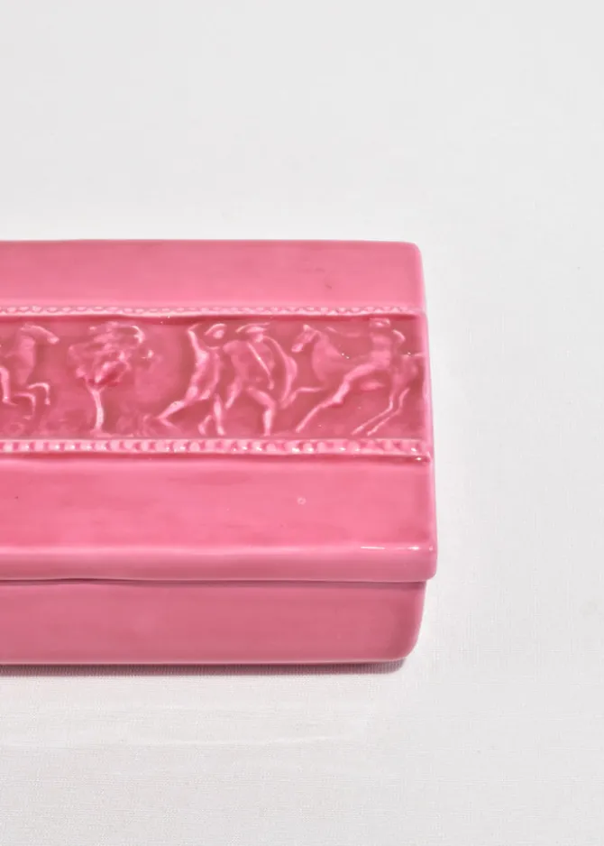 Vintage rectangular ceramic box in a glossy, deep pink glaze. Lid features a raised relief band depicting a classical scene with horses and figures. Stamped on base,Italy.