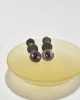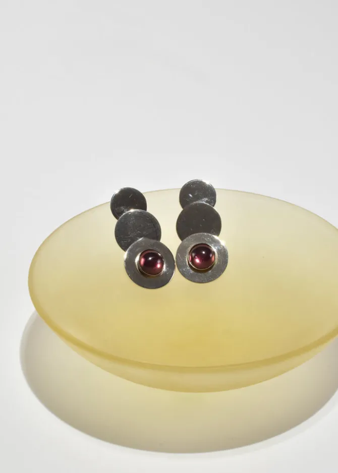 Vintage sterling earrings with three round connected discs and round pink glass cabochons, pierced. Stamped,Crea Ster.