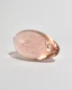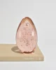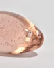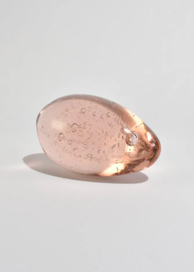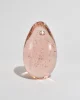 Large pink glass sculpture in an elongated egg form, filled with suspended controlled bubbles.