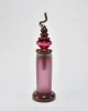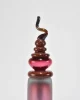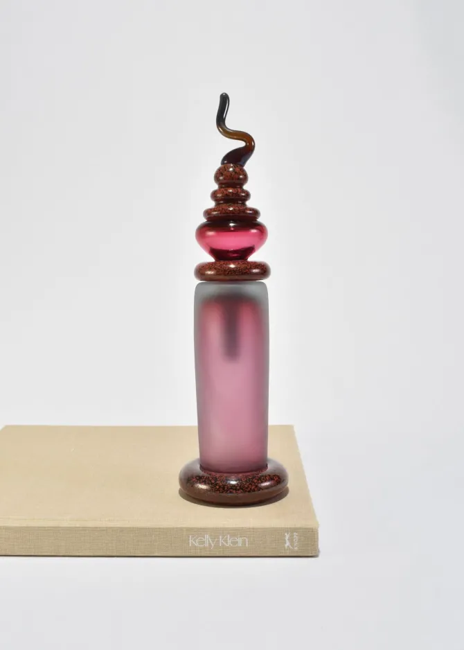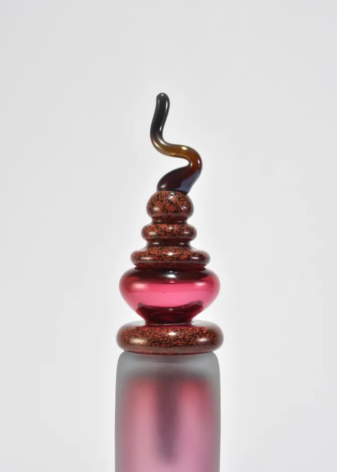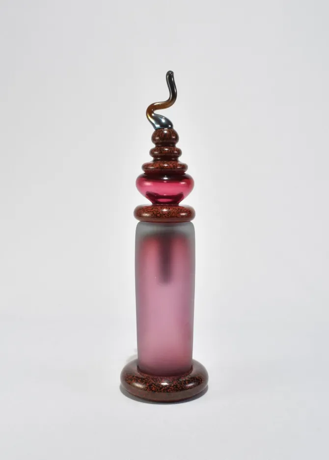 Sculptural postmodern glass vessel with a winding, removable stopper. The rounded body is rendered in a satin pink, resting on a wide circular foot. The stacked form and saturated palette suggest influence from the Memphis movement and late Murano studio glass.