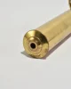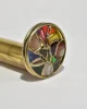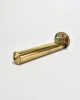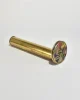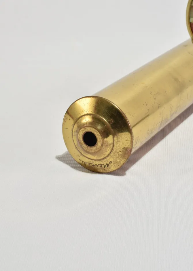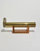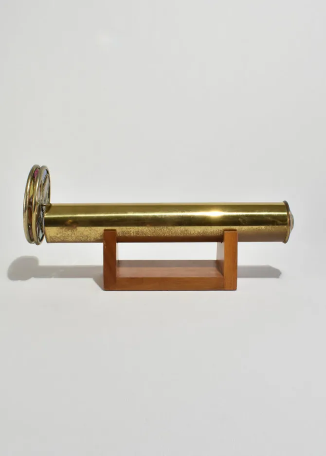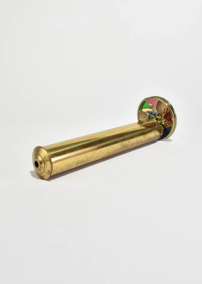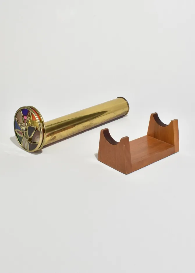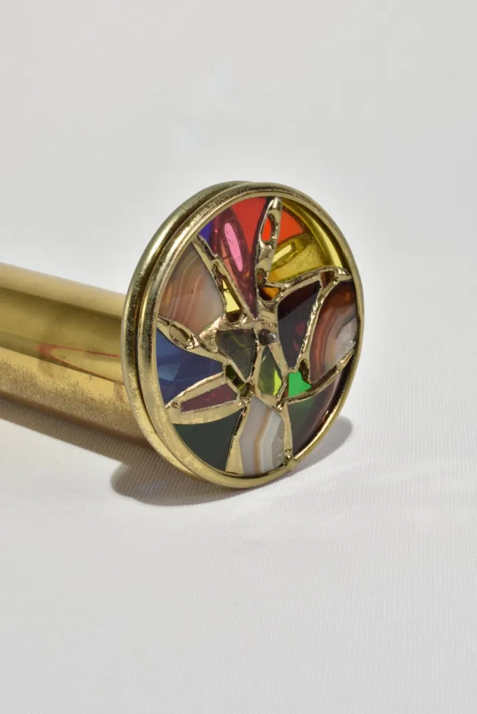 Polished brass kaleidoscope with stained glass mosaic wheel, signed. Features a rotating multicolor glass lens that casts shifting patterns of light. Resting on a wooden base. Signed.