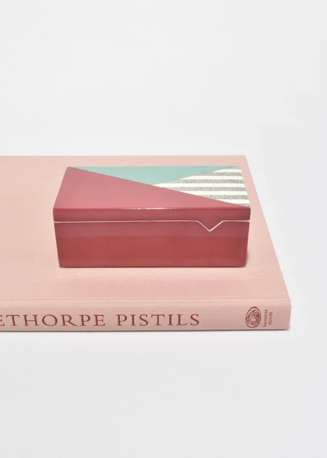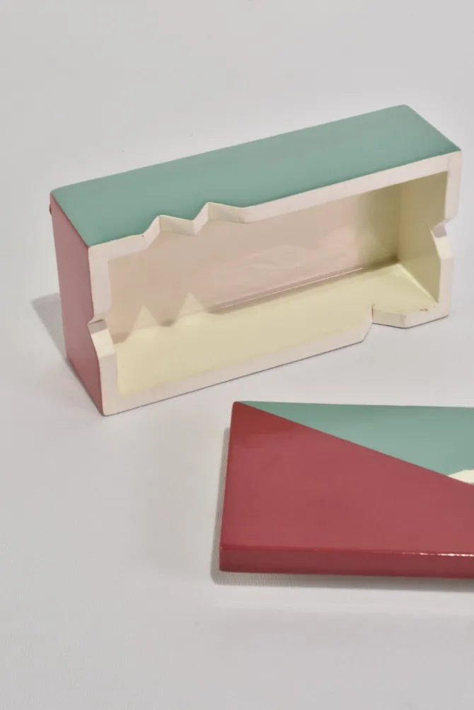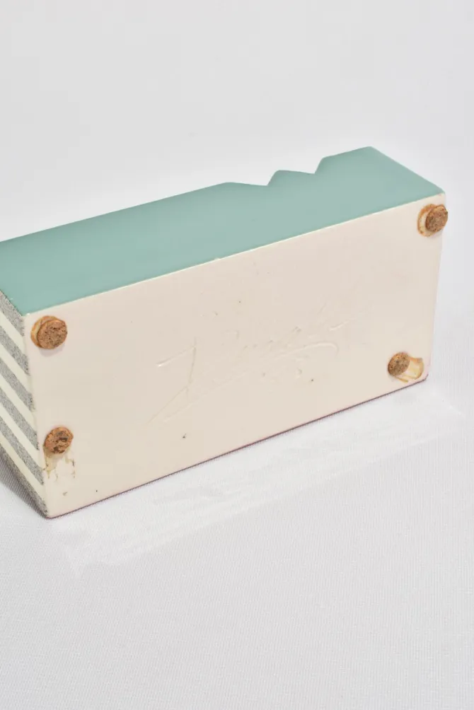 Rare, postmodern ceramic box with colorful geometric pattern. Signed, Duvall ’83.