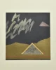 Framed collage on paper by Lou Jones titled ‘Euclid’s Footprint’ combining rice paper, acrylic, and pencil. The composition features pyramidal forms set against a dark ground with layered textures in muted tones.