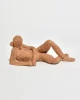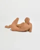 Terracotta sculpture of a reclining female form with elongated limbs. The surface retains a raw, earthy texture that emphasizes the handmade quality and relaxed, grounded pose.