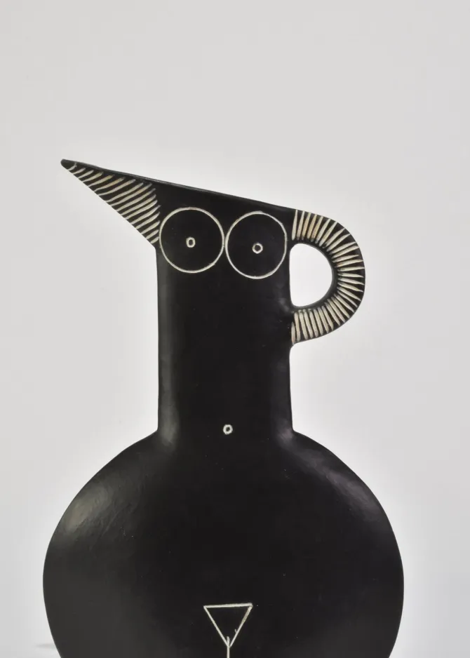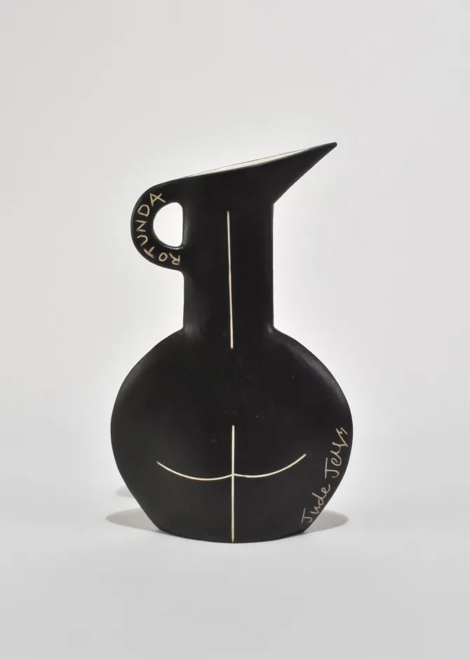 Female nude form ‘Rotunda’ by Jude Jelfs. Slab-built earthenware with vitreous slips and sgraffito. Glazed inside.