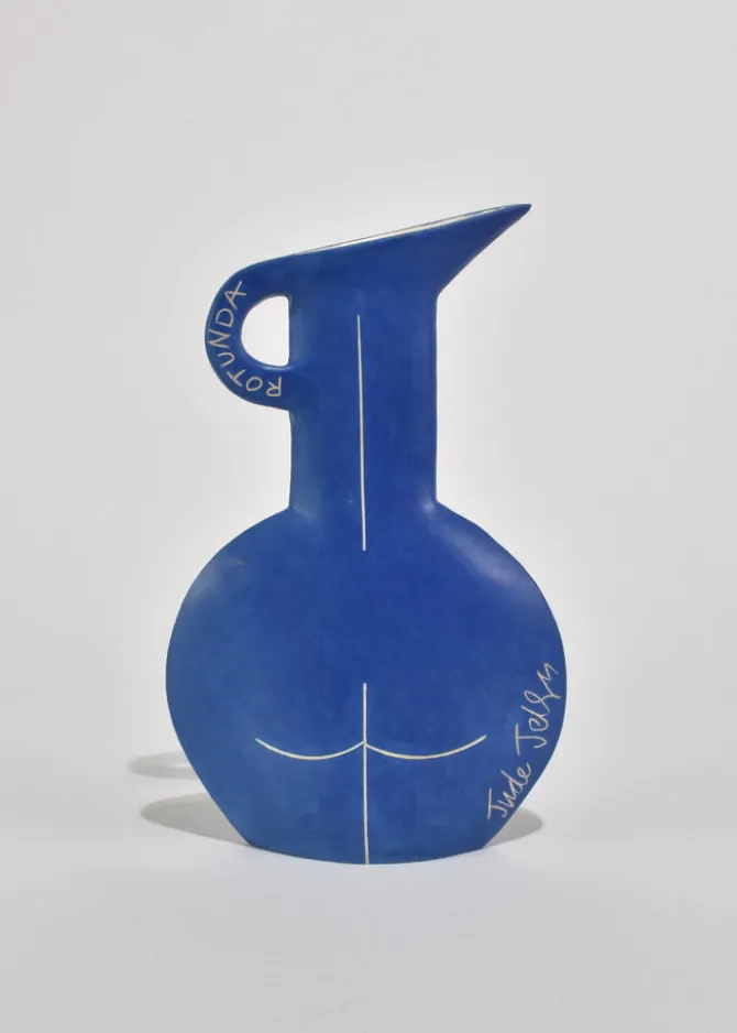 Female nude form ‘Rotunda’ by Jude Jelfs. Slab-built earthenware with vitreous slips and sgraffito. Glazed inside.