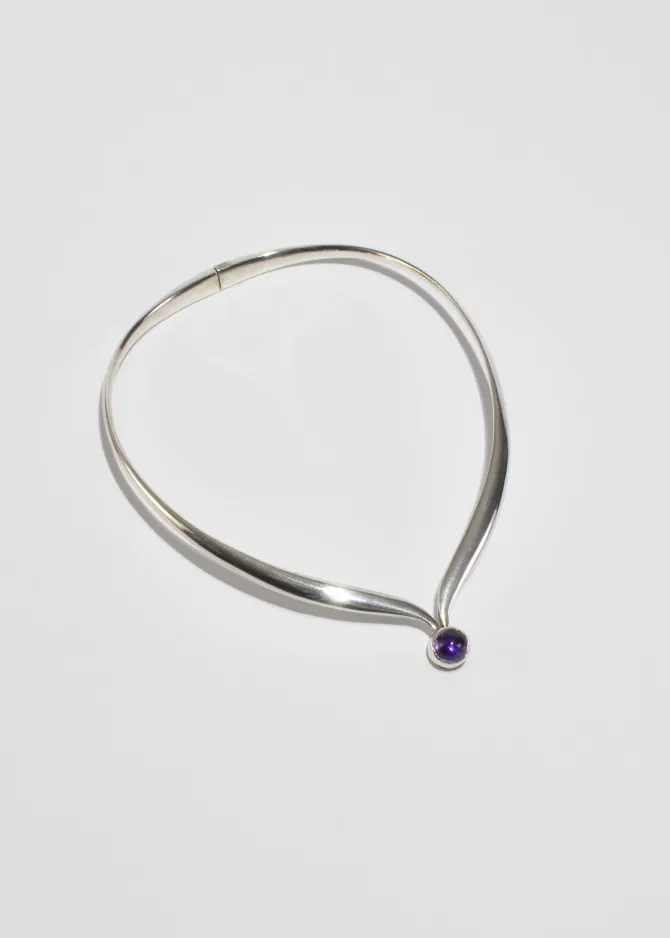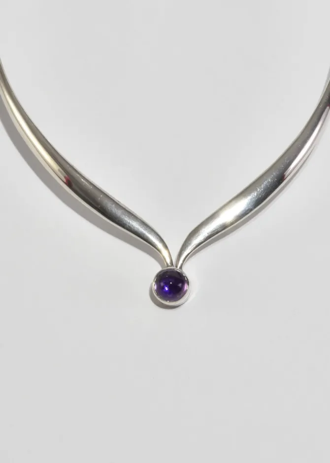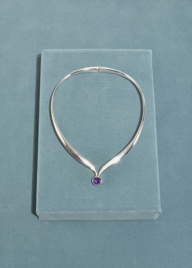 Beautiful, vintage sterling collar necklace with a round amethyst cabochon, box clasp hinge closure. Stamped,Mexico Sterling.