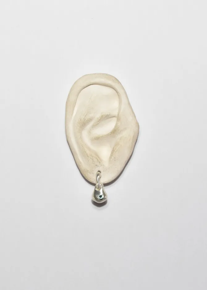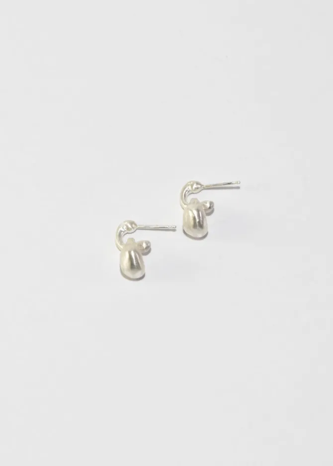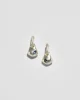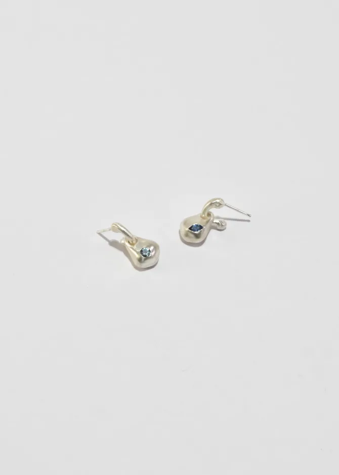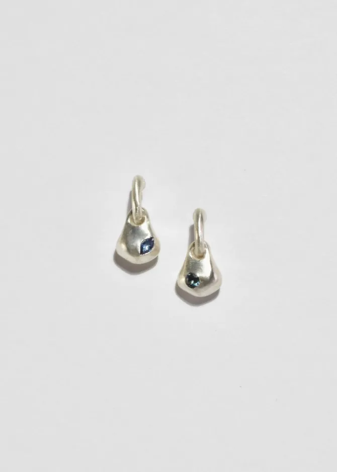Sterling semi hoop earrings with mixed sapphire adorned drop detail. Handmade in the studio of Lizzie Ames in Brooklyn, NY.