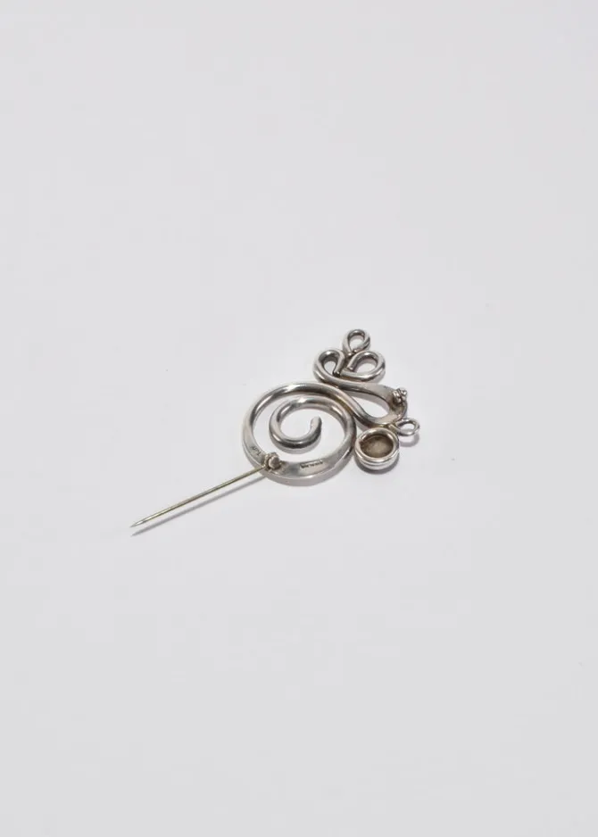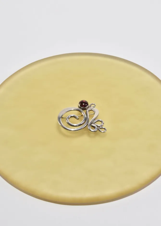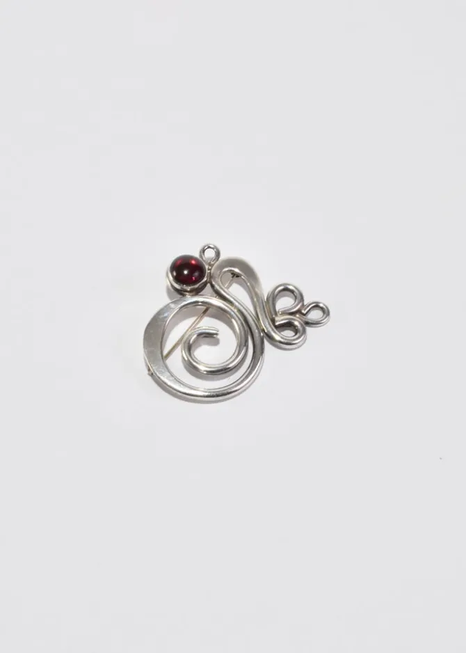 Rare, vintage sterling brooch in a sculptural design with a round garnet cabochon, pin-back closure. Stamped,Sterling TOW.
