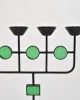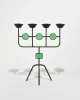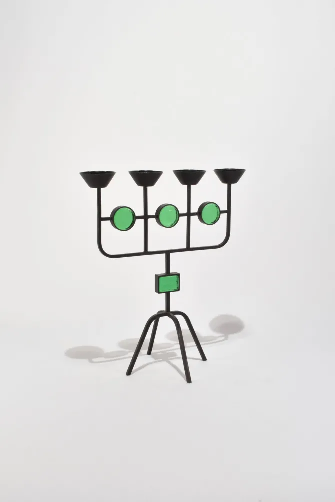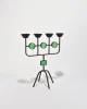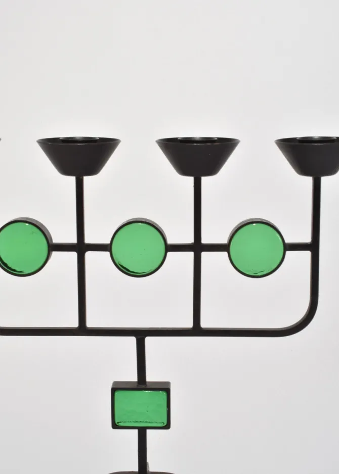 Rare, vintage sculptural candelabra attributed to Gunnar Ander for Ystad-Metall, ca. 1950s.Wrought iron frame with geometric green glass detail and four flared holders.