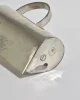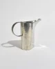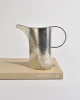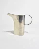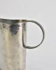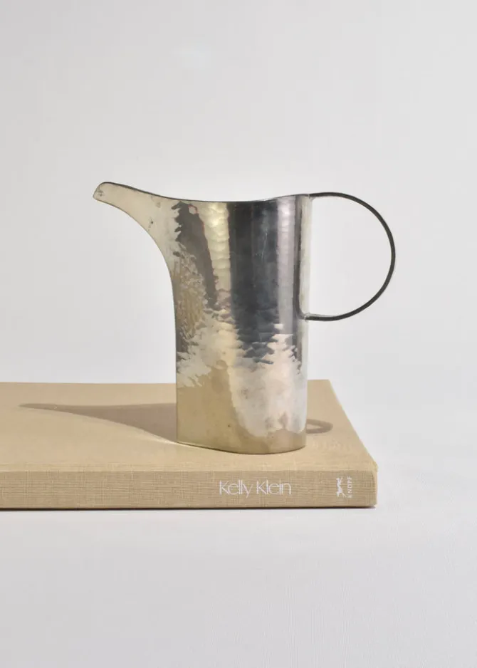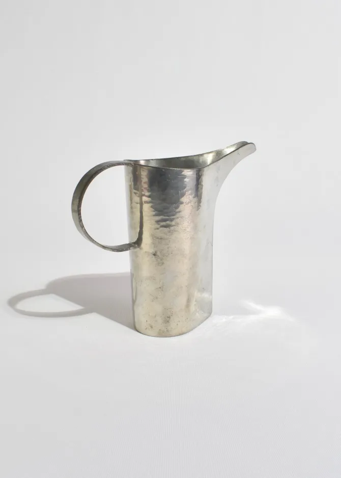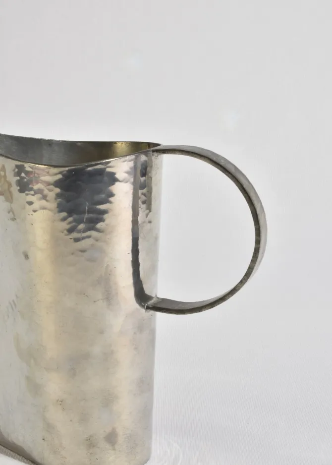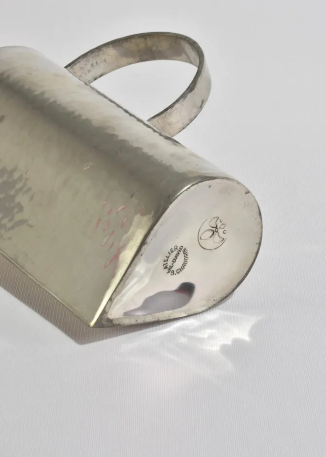 A sculptural pewter pitcher with a wide flaring spout, a circular handle, and beautiful hand-hammered texture. Marked on the base:Atelier Val-David, B. Chaudron.