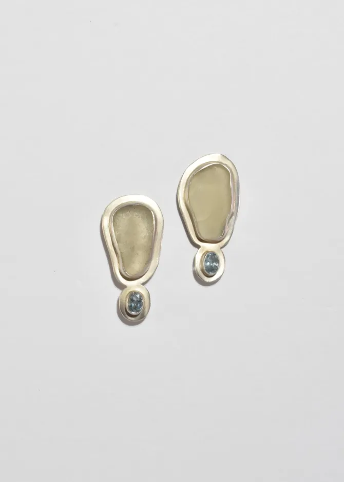 Rare, vintage handmade sterling earrings with clear sea glass and oval faceted blue topaz stones, pierced. Signed by the artist,Ocean Angel Sonja Monds.