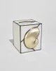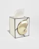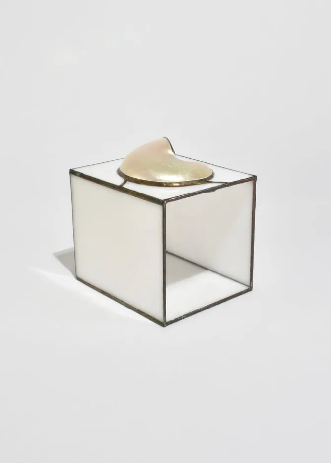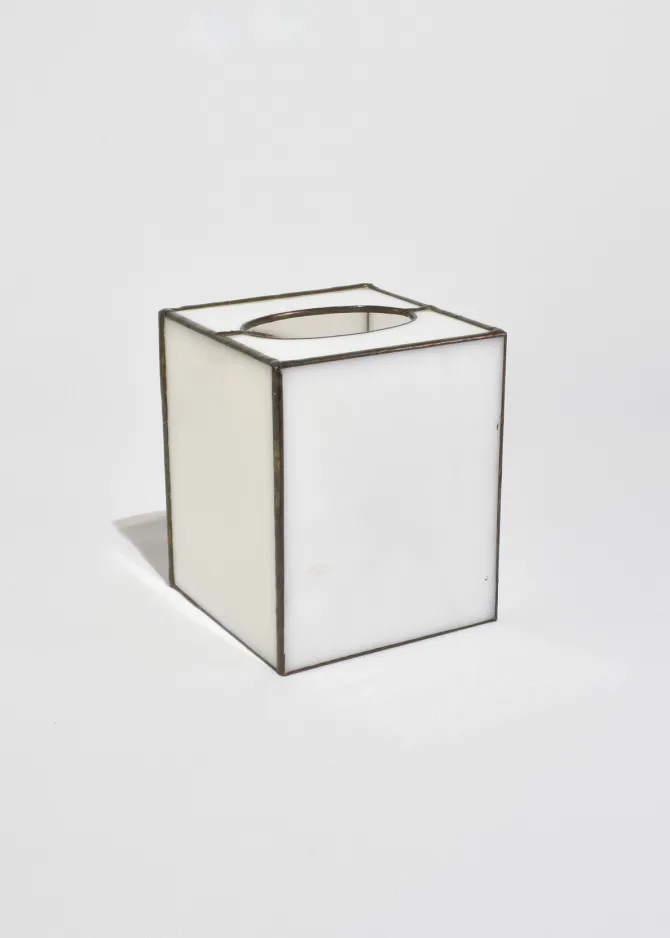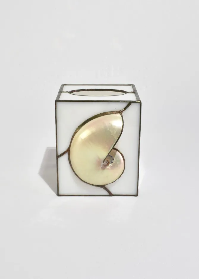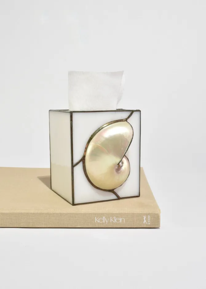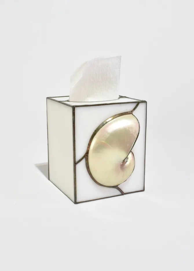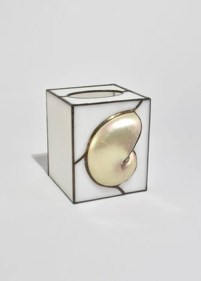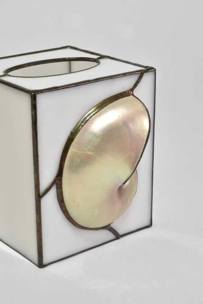 Stunning, stained glass tissue box cover featuring an applied shell set against softly opaline glass panels.