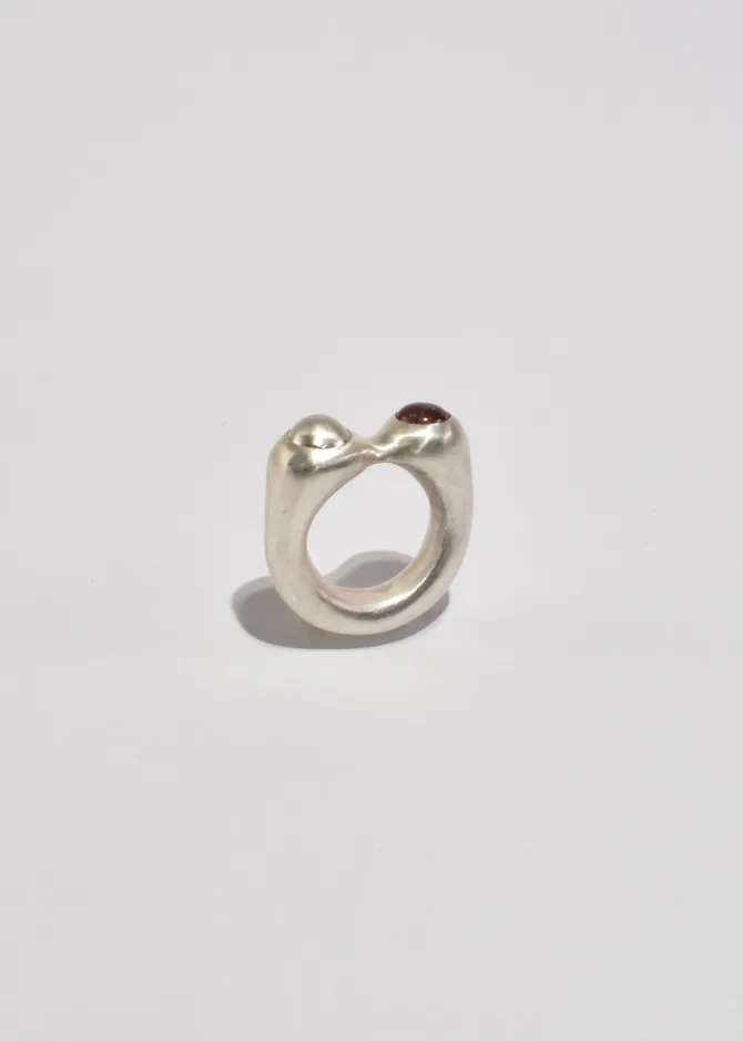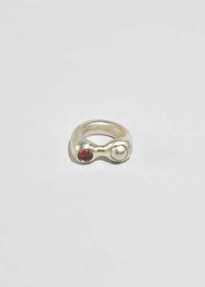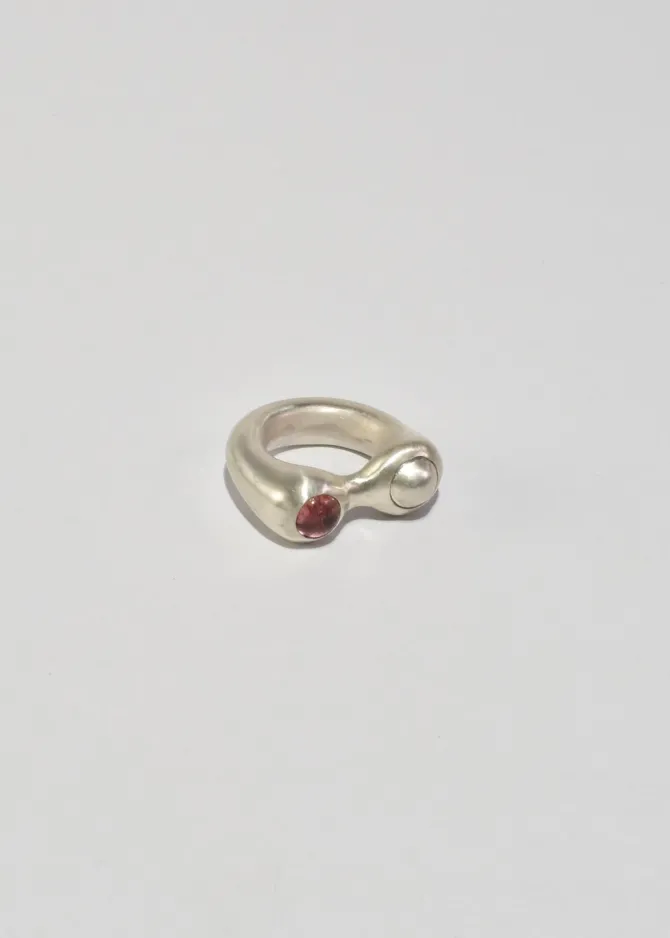 Sterling hand carved and cast organic shaped ring with a round pink tourmaline stones and a round silver cabochon.