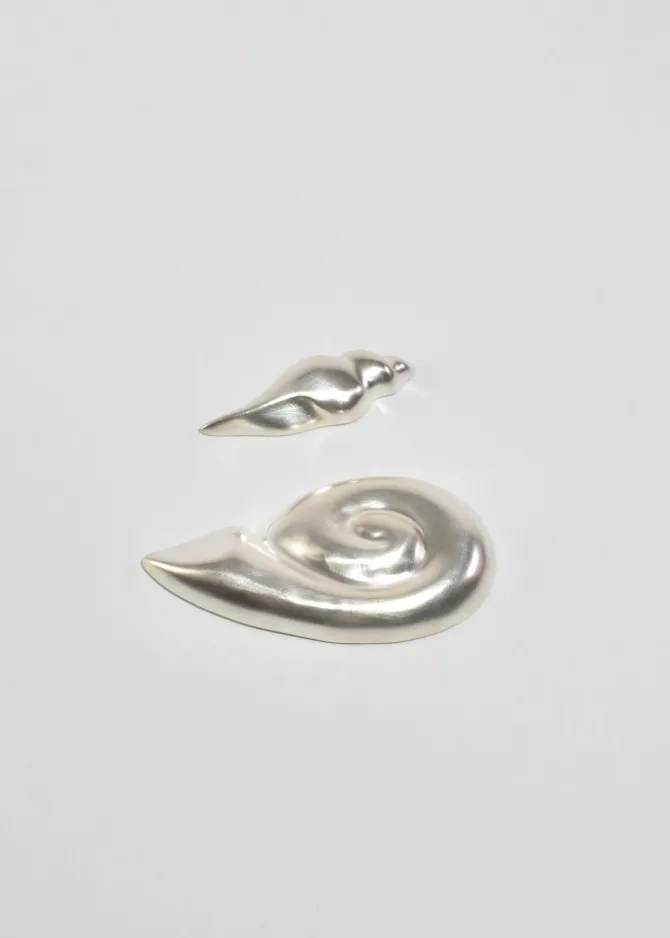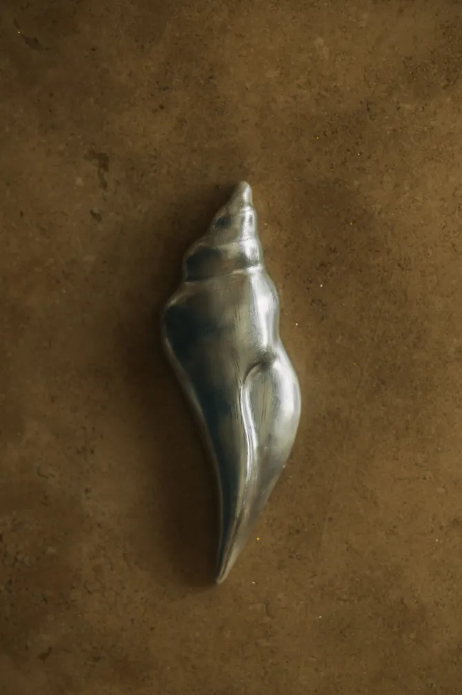 Small ceramic conch shell cutlery or chopstick rest in a silver glaze. By IAAC Crafts ceramic studio, made in South Korea.