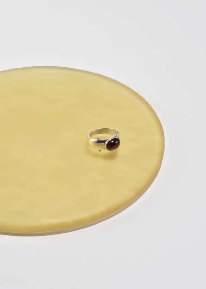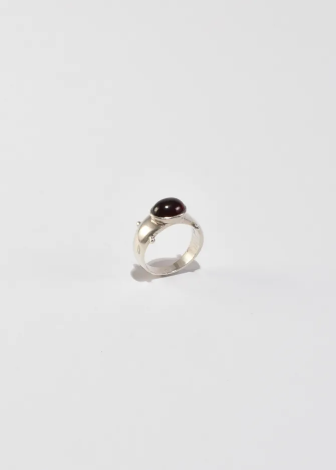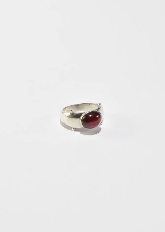 Beautiful, vintage sterling ring with an oval garnet cabochon and sphere detail. Stamped,925.