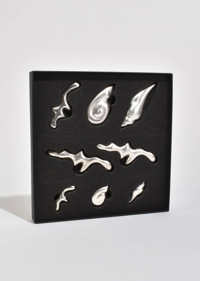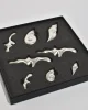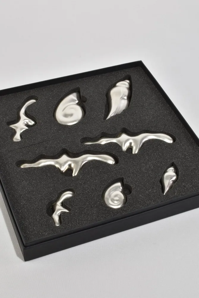 Beautiful ceramic shell cutlery rest gift set in a silver glaze. Set includes eight shell rests in various shapes and sizes, packaged in a gift box.
