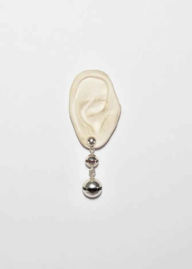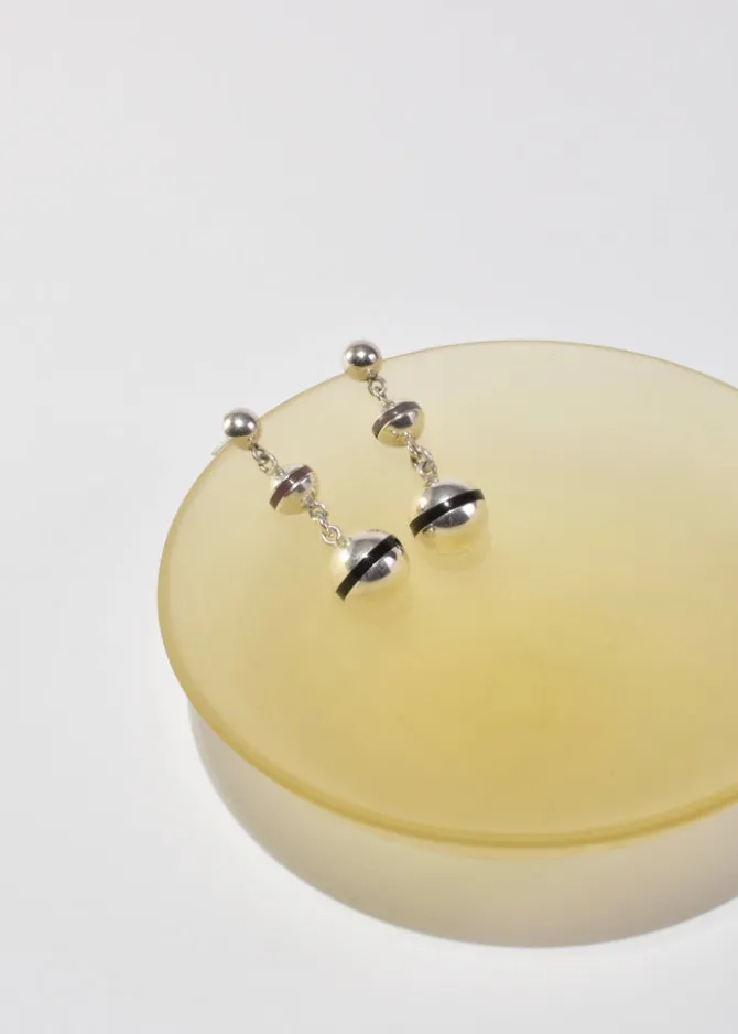 Vintage, sterling earrings with cascading spheres and enamel stripe detail, pierced.