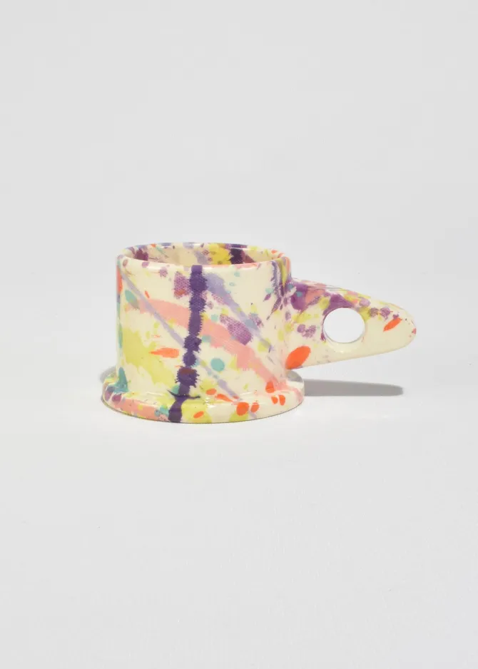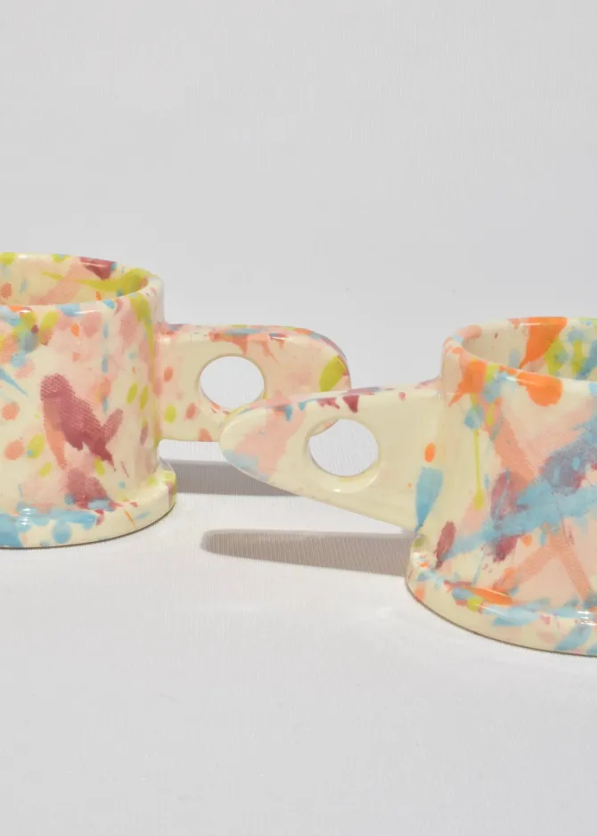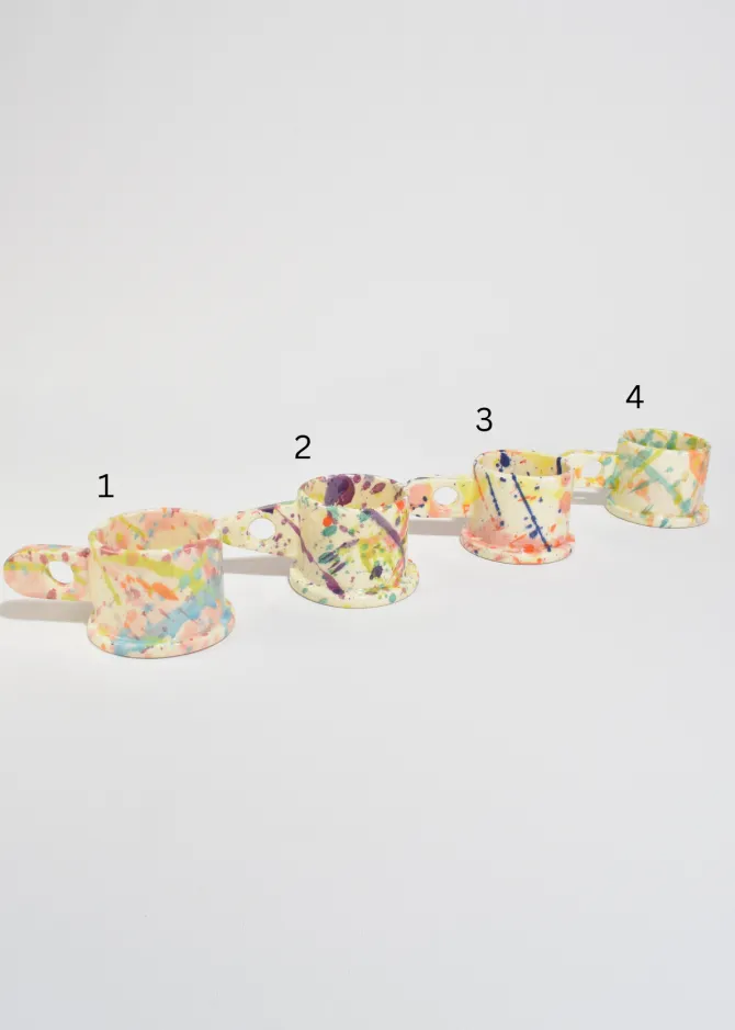 One-of-a-kind Splatter Mugs designed by Peter Shire. These functional and sculptural mugs are crafted by Echo Park Pottery in Los Angeles using slab construction and individually hand-painted. Some of the mugs vary in texture.Sold individually.