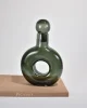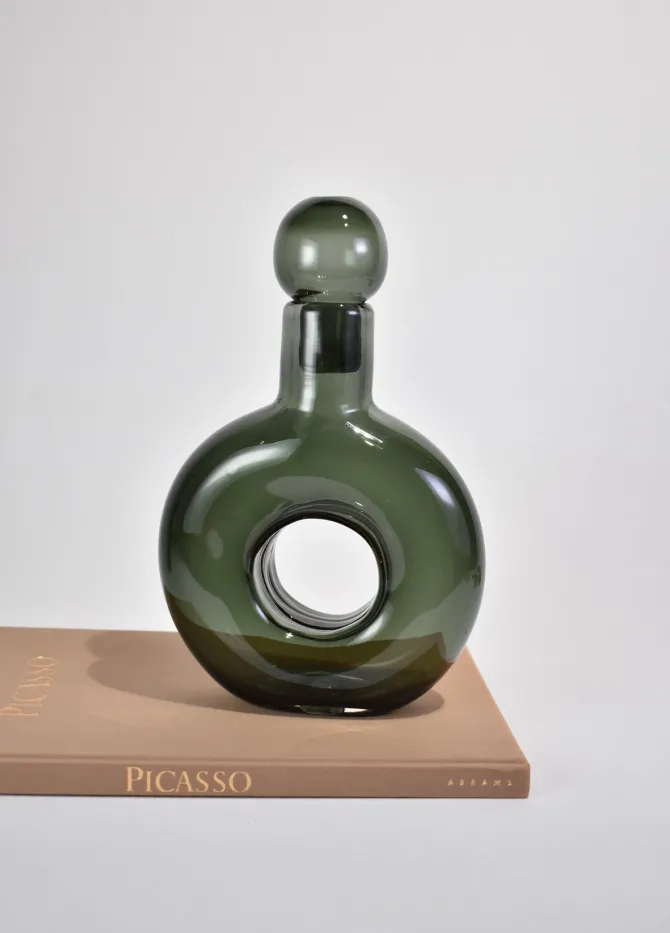 Rounded decanter with cylindrical neck in sea. Use it to decant wine at your next dinner party, a vase for favorite flowers or display on its own as a sculptural mantle piece. Holds approx. 20 fl. oz