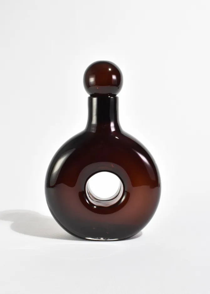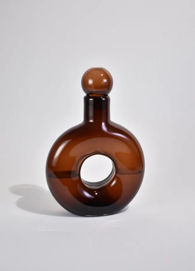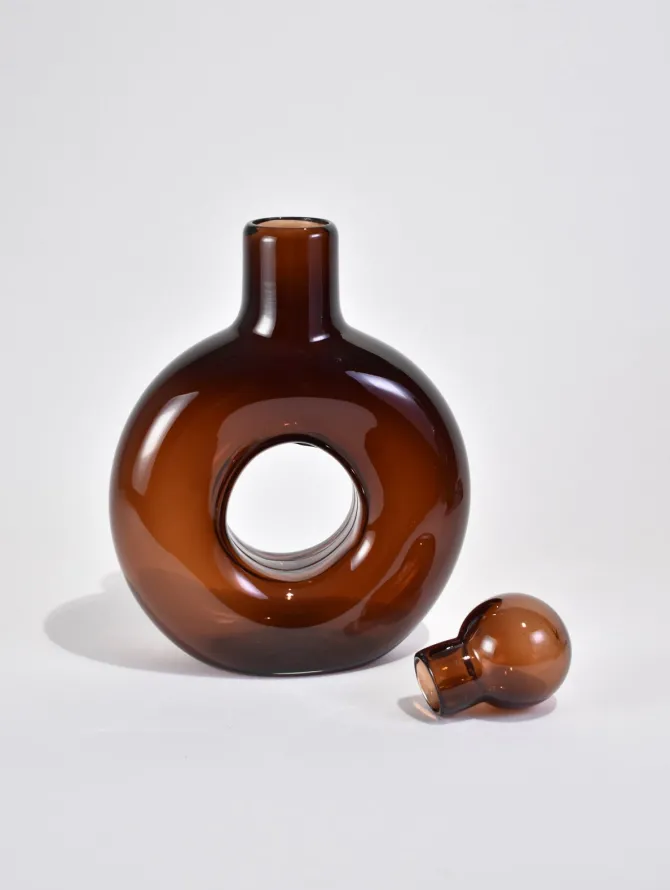 Rounded decanter with cylindrical neck in umber. Use it to decant wine at your next dinner party, a vase for favorite flowers or display on its own as a sculptural mantle piece.Holds approx. 20 fl. oz
