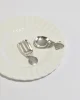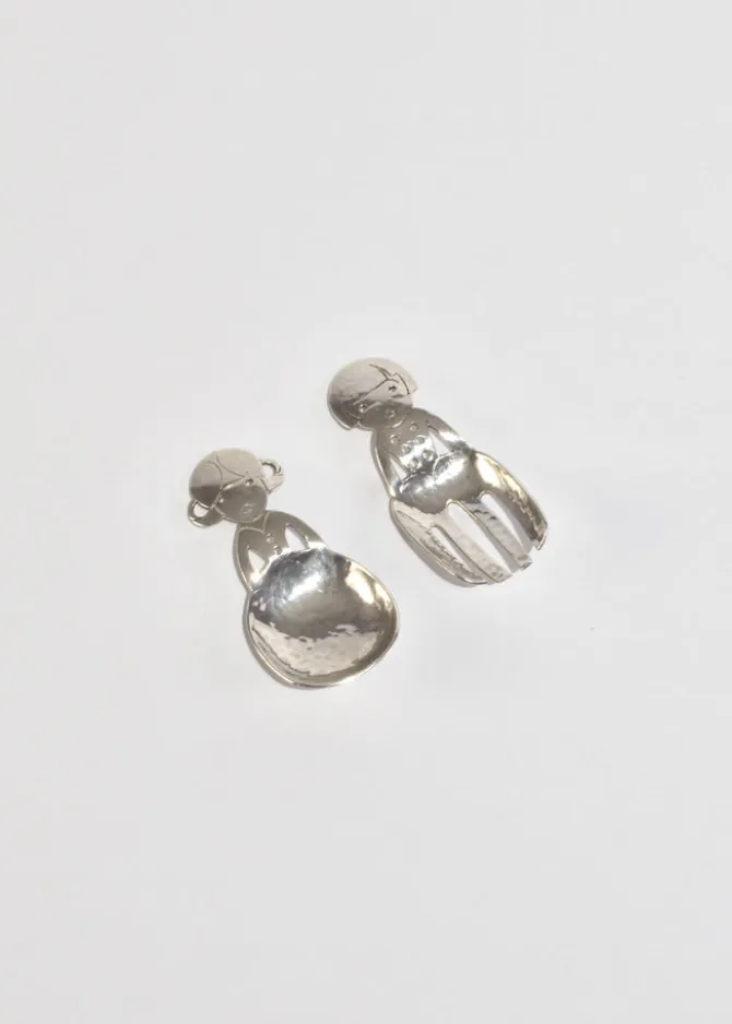 A charming pair of hand-hammered sterling utensils, one fork and one spoon, each cut and etched in the shape of a stylized girl and boy. MarkedSterling on the reverse.