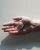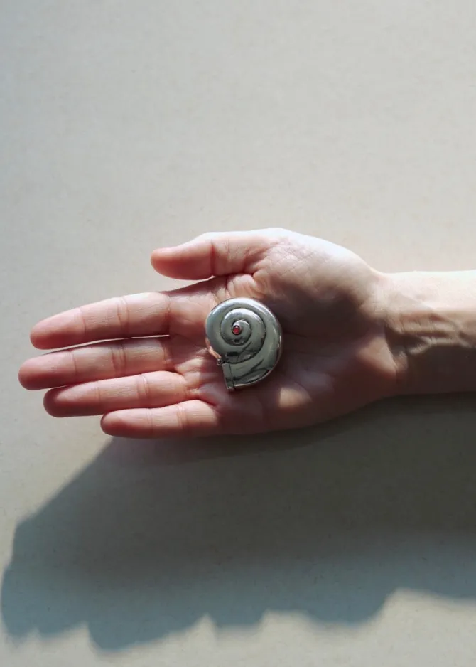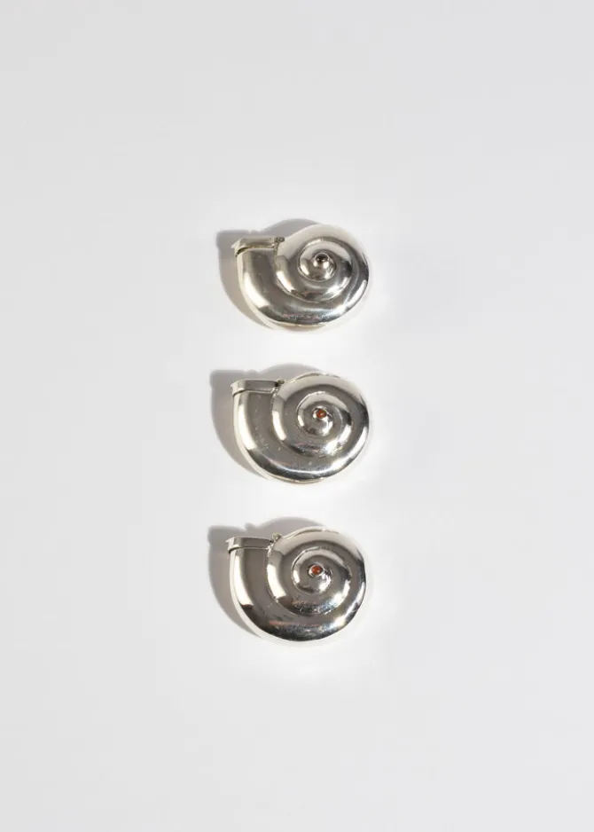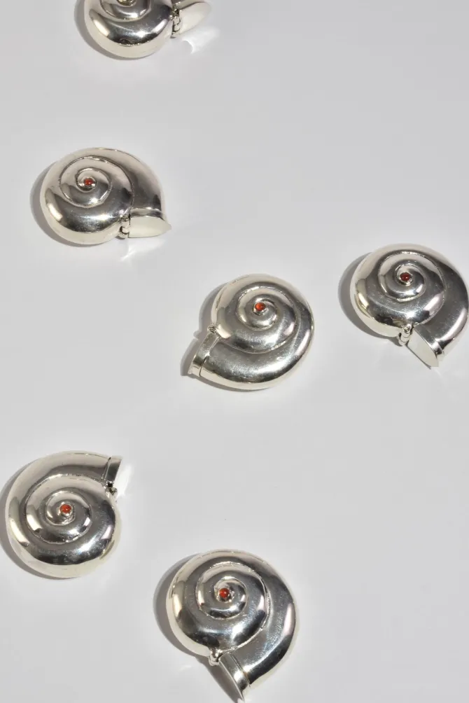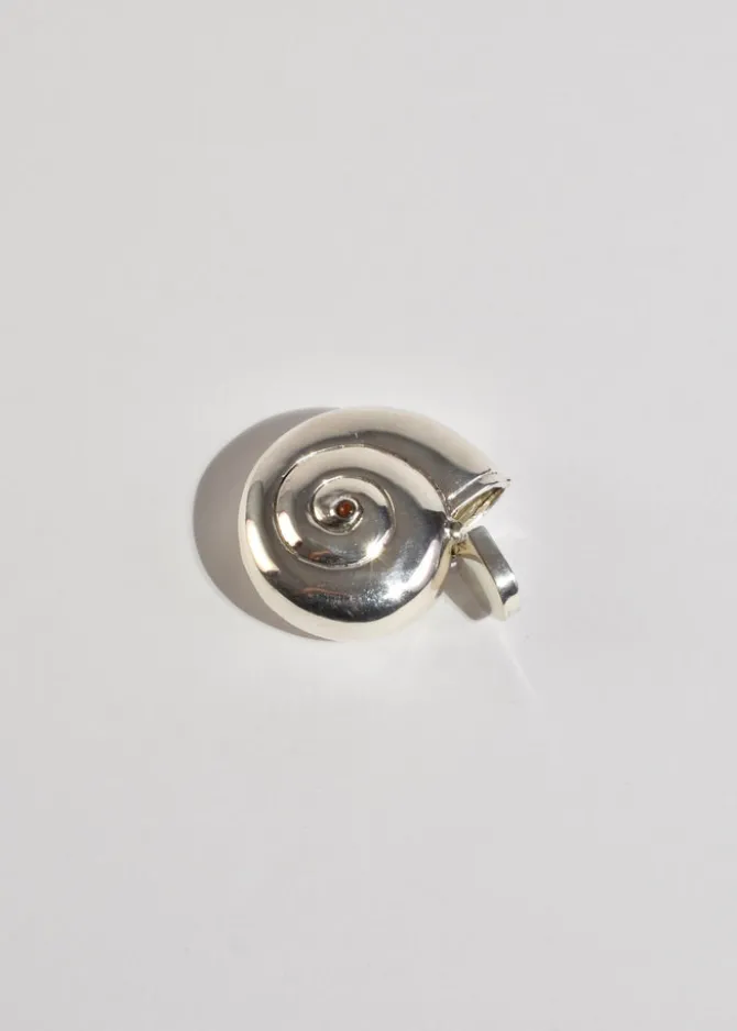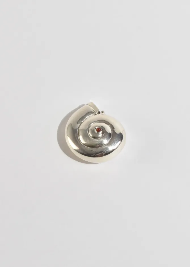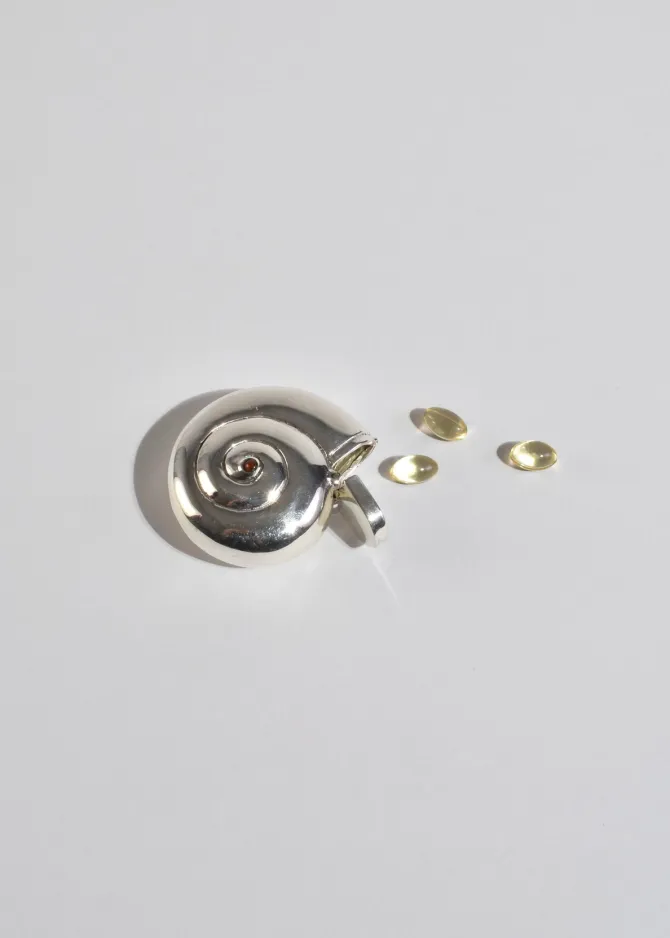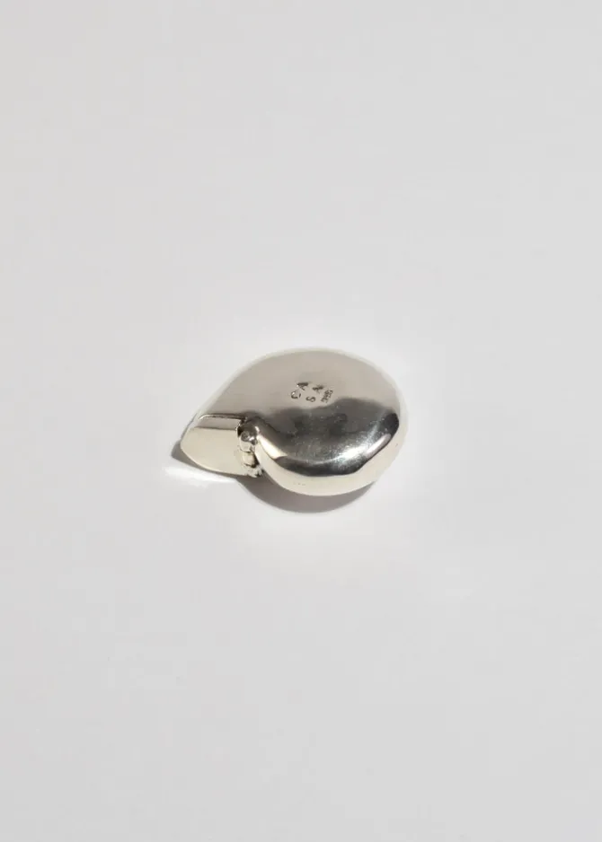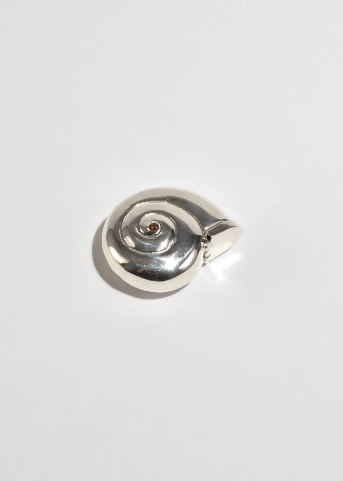 A petite, polished sterling shell box for storing daily pills or supplements. Substantially weighted and handcrafted in Mexico from sterling silver, it features a carnelian gemstone at the center and a hinged lid. Each piece is stampedCASA 925 at the base.