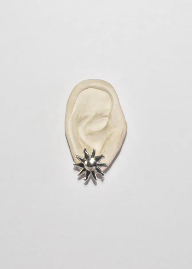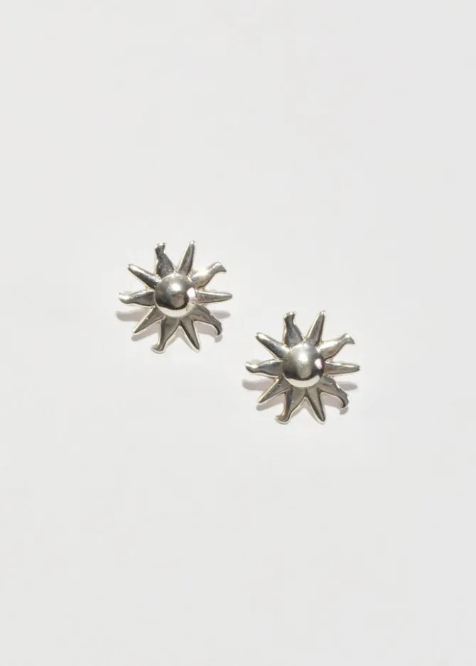 Rare, vintage sculptural sterling earrings in the shape of a sun, pierced. StampedSterling.