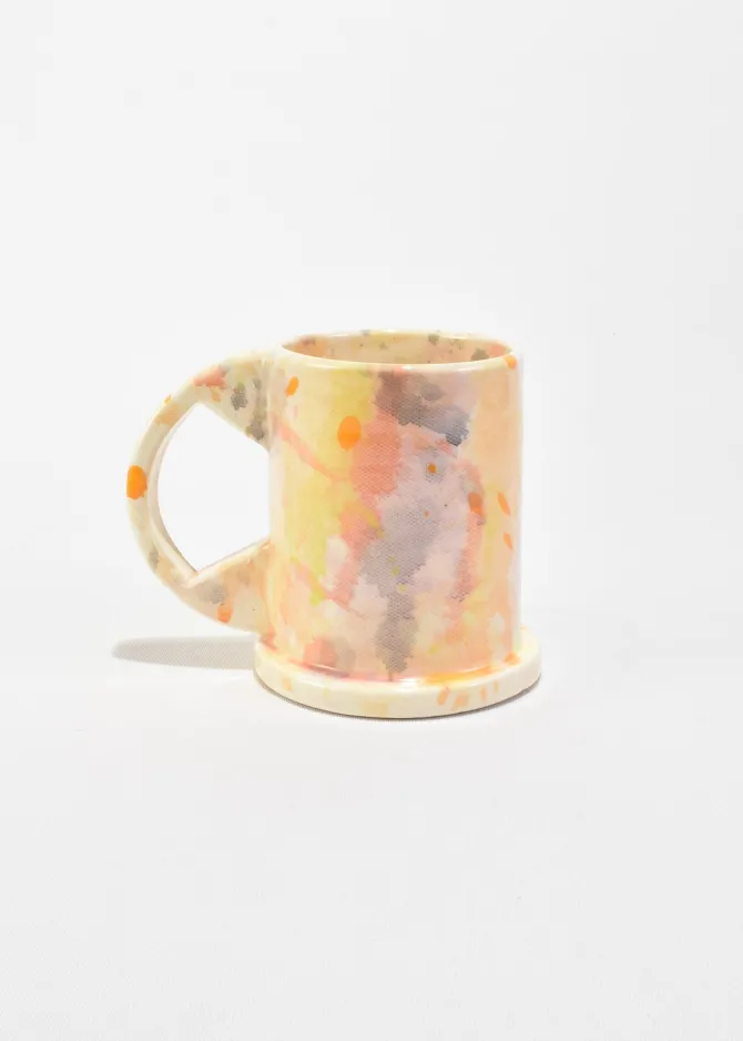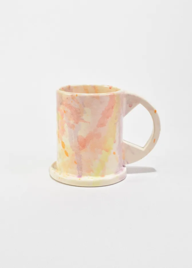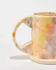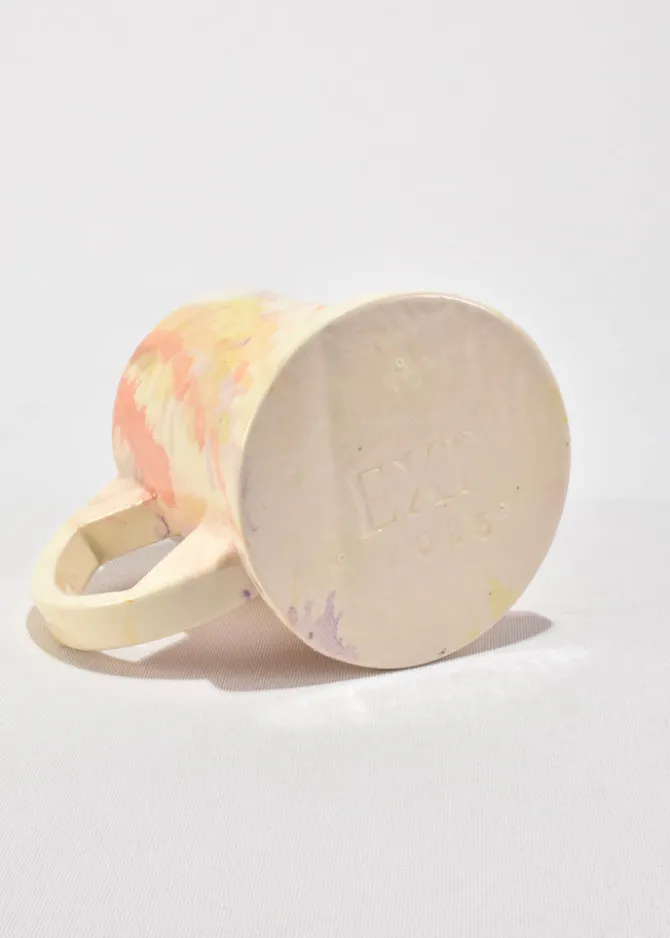 One-of-a-kind Tall Splatter Mugs designed by Peter Shire. These functional and sculptural mugs are crafted by Echo Park Pottery in Los Angeles using slab construction and individually hand-painted. Stamped on base:EXP 2025.