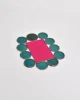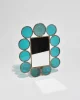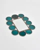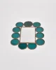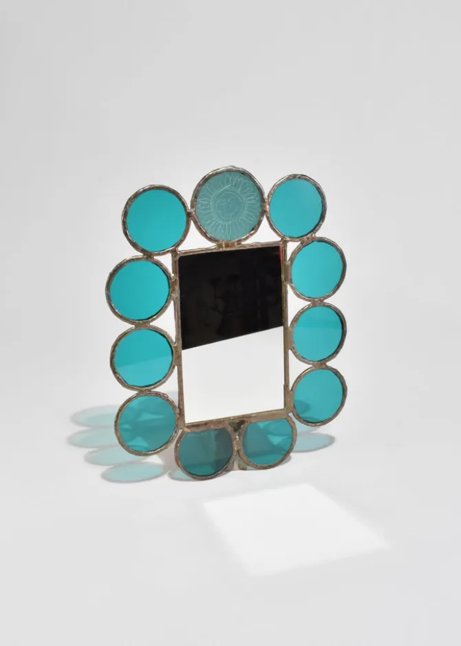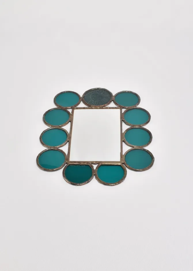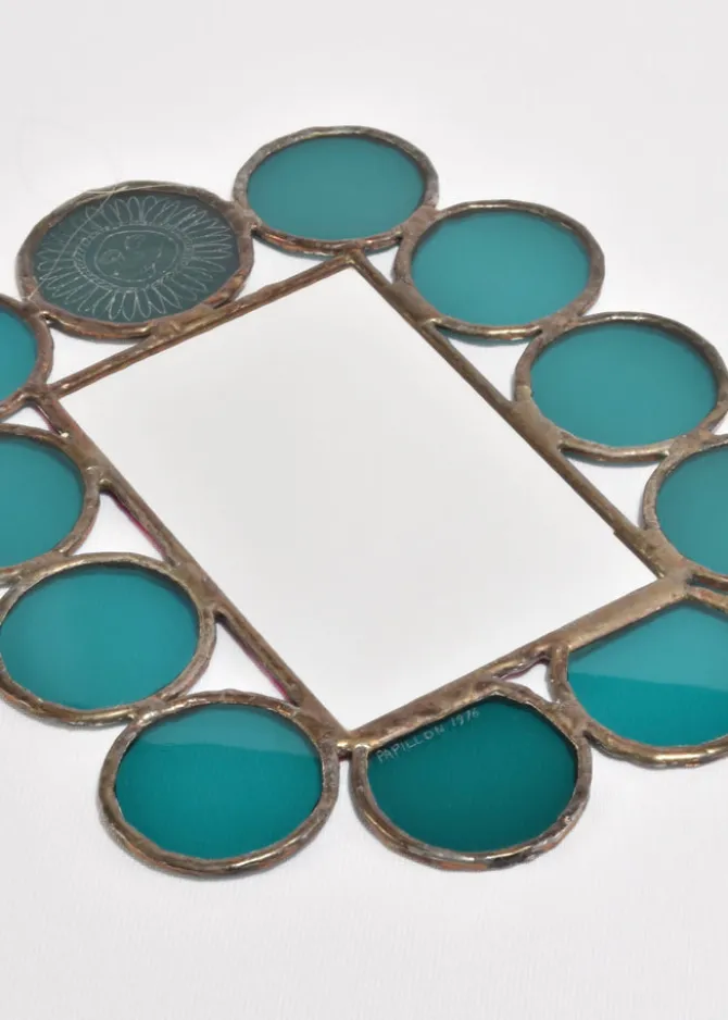 Handmade mirror with a rectangular form bordered by round teal glass medallions in leaded framing. One pane is etched with a stylized sun face.