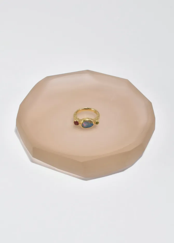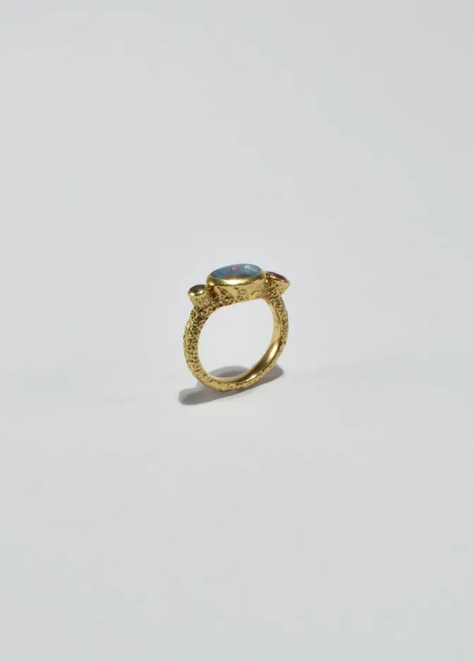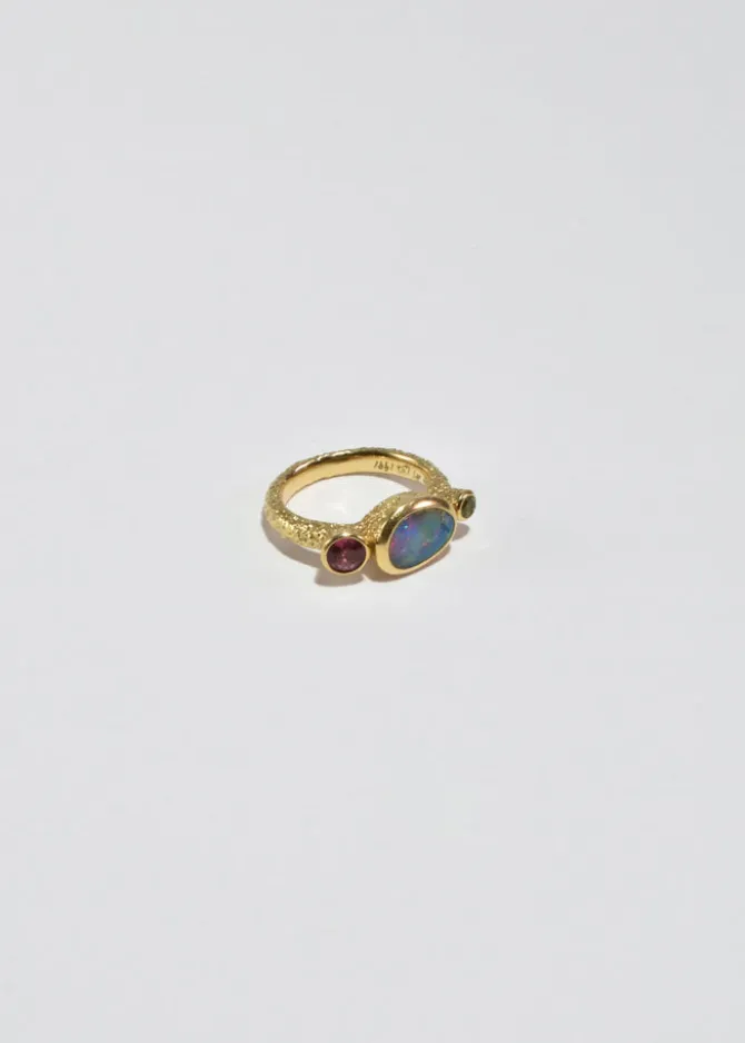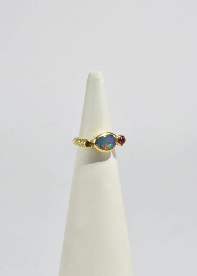 Stunning vintage hand-crafted gold ring with texture detail and opal, peridot, and ruby stones. Signed18k, 1991.