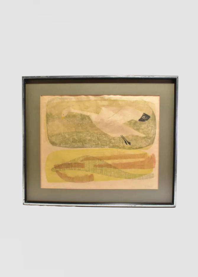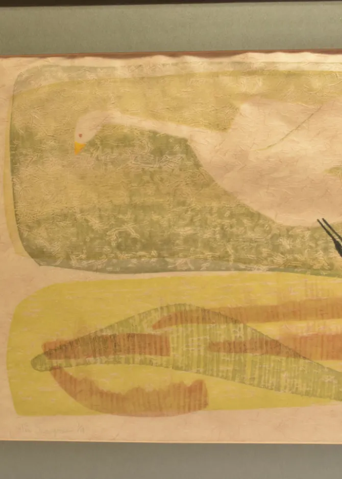 Woodblock print on textured paper, titled The Snowgoose and numbered 1/18 at lower left, signed at lower right. A stylized white bird glides across a muted green field, mirrored by an abstracted form below in soft yellows and browns.