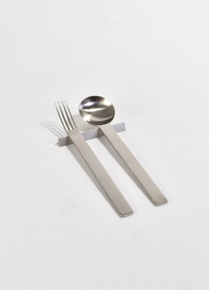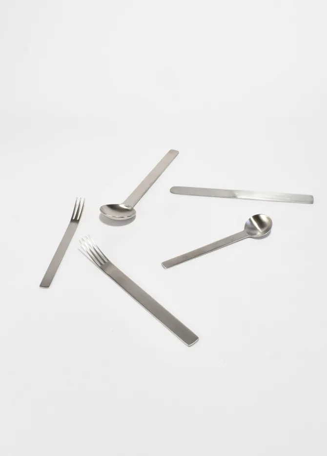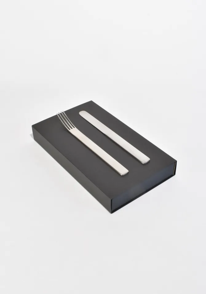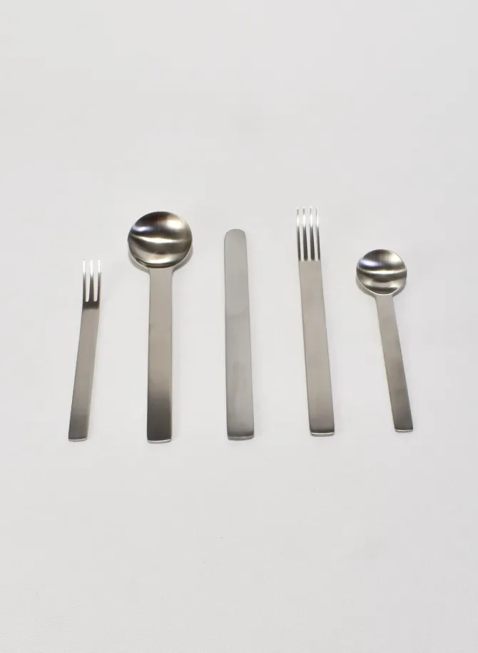 5-piece boxed cutleryset ‘TI-1’ by Japense designer Takenobu Igarashi, ca. 1990.Made from lightweight 18/10 stainless steel in a matte finish, the series is finished by 40-50 production processes combining human hand and machinery. Each piece is stampedTsubame-Shinko, Made in Japan.