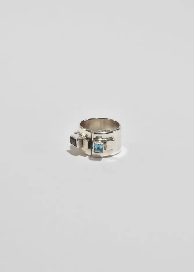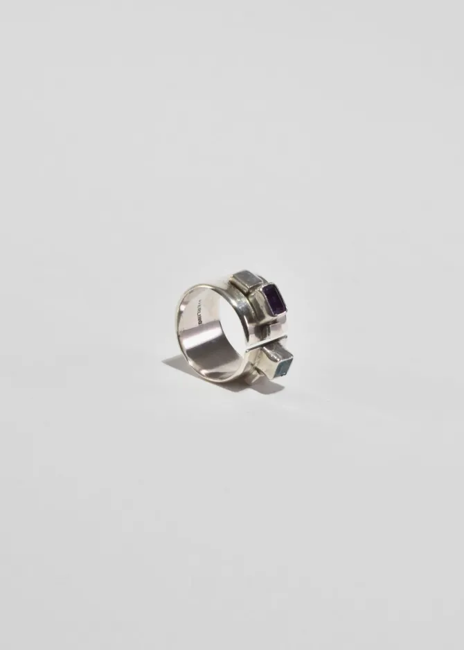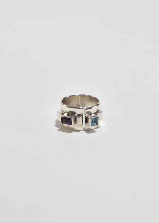Vintage, sterling wide band ring with faceted amethyst and blue topaz stones. Stamped,Sterling.
