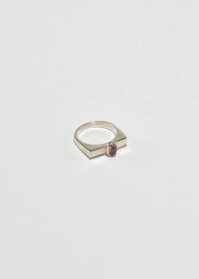 Classic, vintage sterling ring with a flat bar and an oval pink tourmaline cabochon. Stamped,925.
